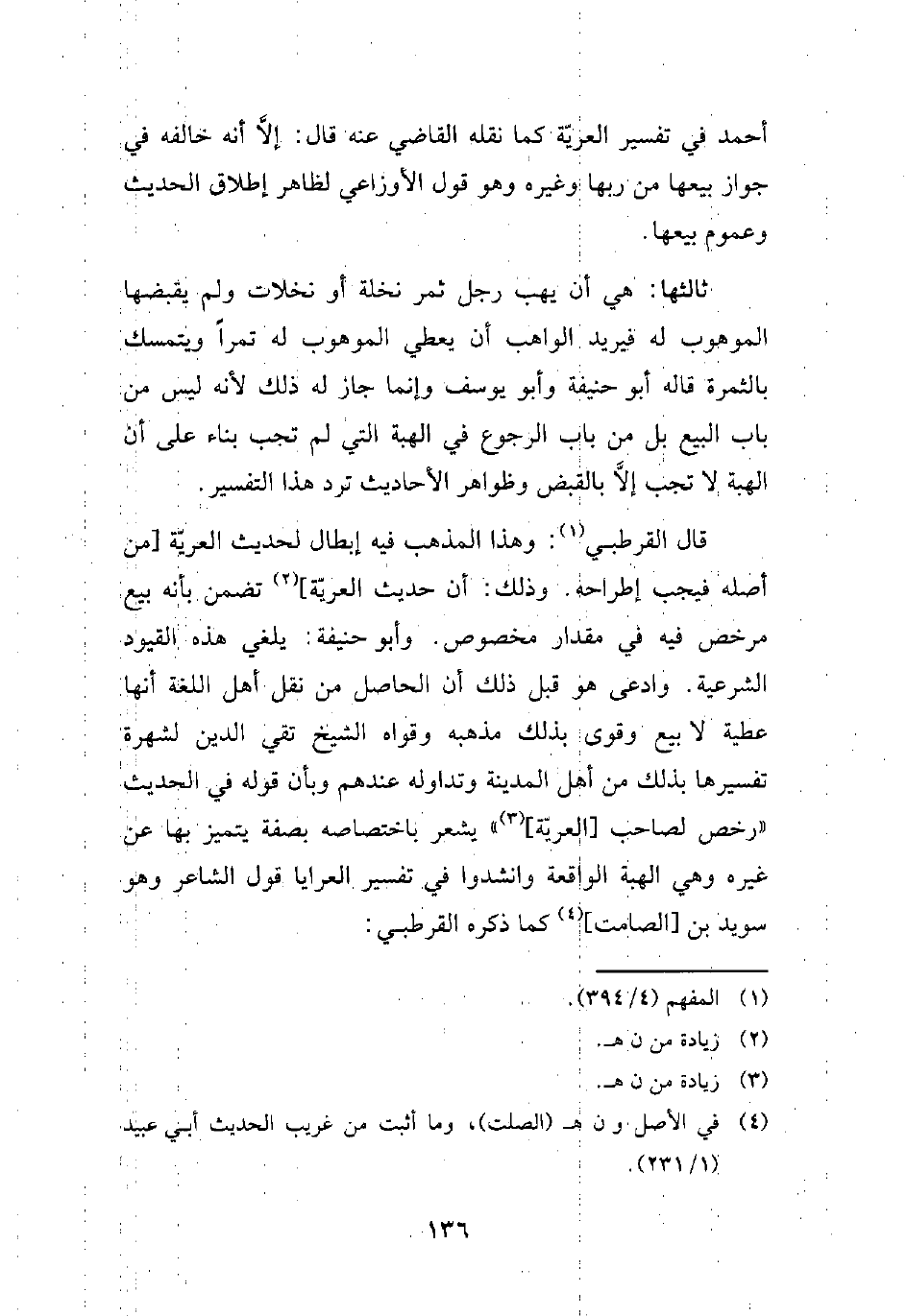 قال القرطبي (¬1): وهذا المذهب فيه إبطال لحديث العريّة [من أصله فيجب إطراحه. وذلك: أن حديث العريّة] (¬2) تضمن بأنه بيع مرخص فيه في مقدار مخصوص. وأبو حنيفة: يلغي هذه القيود الشرعية. وادعى هو قبل ذلك أن الحاصل من نقل أهل اللغة أنها عطية لا بيع وقوى بذلك مذهبه وقواه الشيخ تقي الدين لشهرة تفسيرها بذلك من أهل المدينة وتداوله عندهم وبأن قوله في الحديث "رخص لصاحب [العريّة] (¬3) " يشعر باختصاصه بصفة يتميز بها عن غيره وهي الهبة الواقعة وانشدوا في تفسير العرايا قول الشاعر وهو سويد بن [الصامت] (¬4) كما ذكره القرطبي: