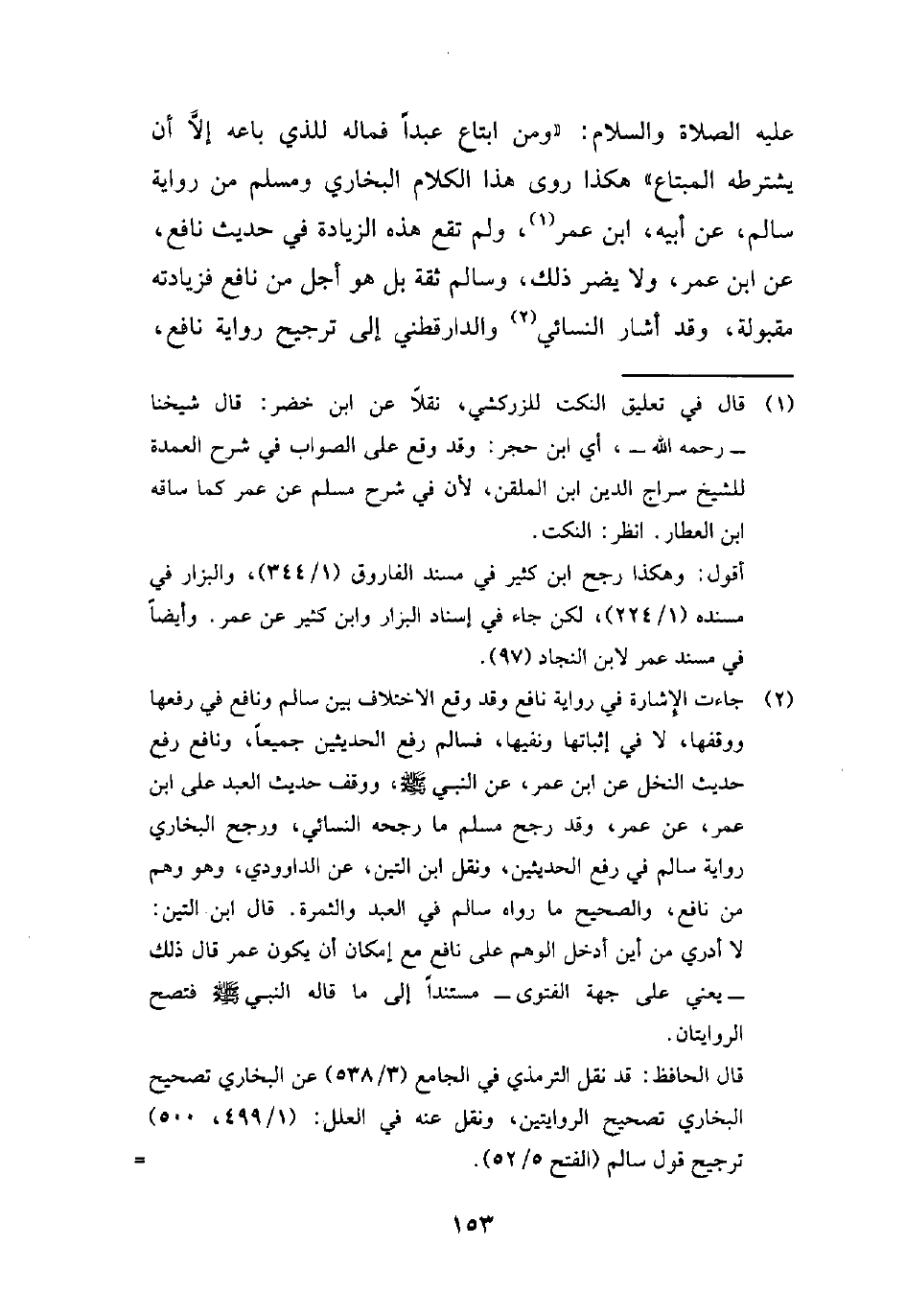 -عليه الصلاة والسلام-: "ومن ابتاع عبداً فماله للذي باعه إلاَّ أن يشترطه المبتاع" هكذا روى هذا الكلام البخاري ومسلم من رواية سالم، عن أبيه، ابن عمر (¬1)، ولم تقع هذه الزيادة في حديث نافع، عن ابن عمر، ولا يضر ذلك، وسالم ثقة بل هو أجل من نافع فزيادته مقبولة، وقد أشار النسائي (¬2) والدارقطني إلى ترجيح رواية نافع،