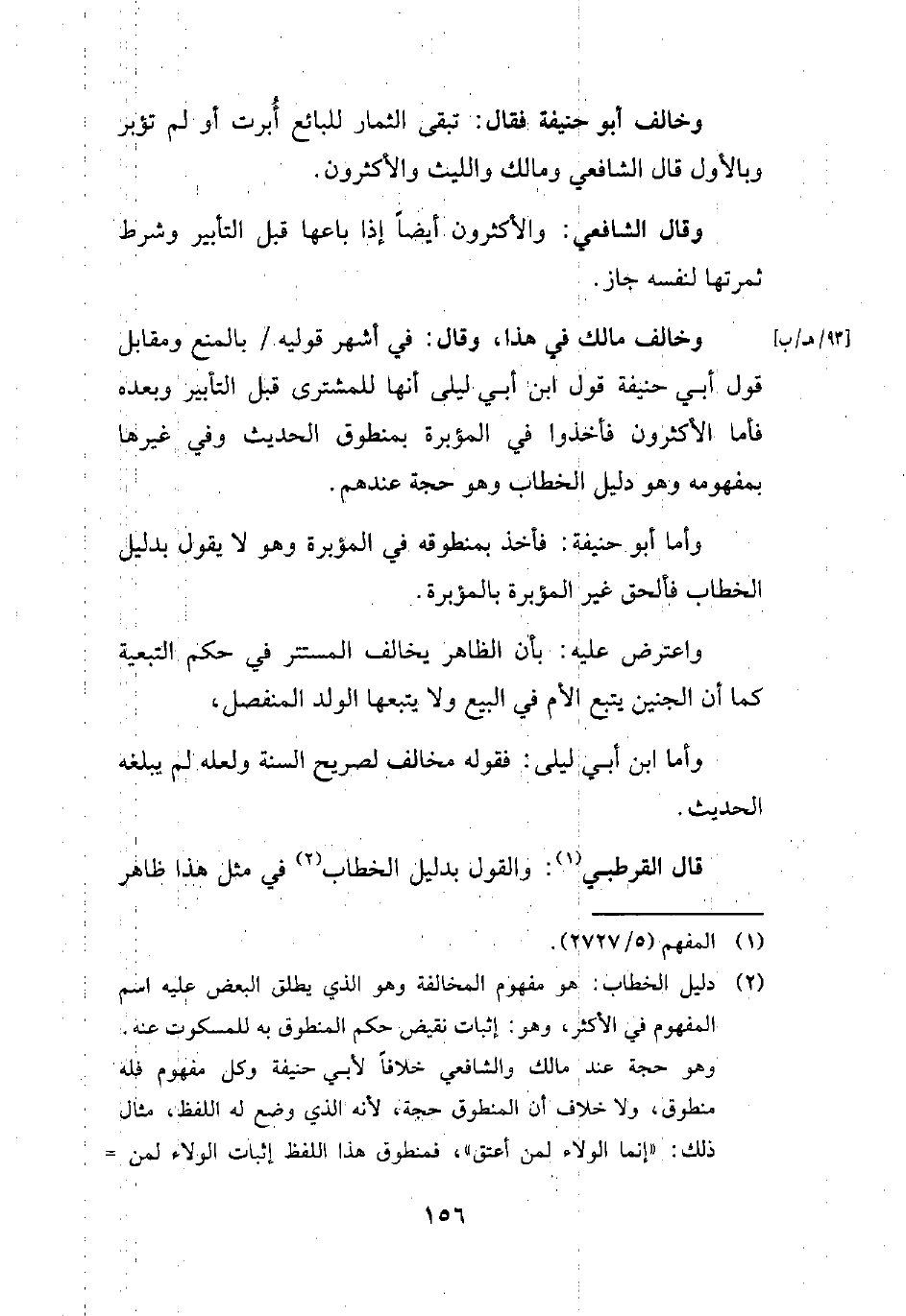 (¬2) دليل الخطاب: هو مفهوم المخالفة وهو الذي يطلق البعض عليه اسم المفهوم في الأكثر، وهو: إثبات نقيض حكم المنطوق به للمسكوت عنه. وهو حجة عند مالك والشافعي خلافاً لأبي حنيفة وكل مفهوم فله منطوق، ولا خلاف أن المنطوق حجة، لأنه الذي وضع له اللفظ، مثال ذلك: "إنما الولاء لمن أعتق"، فمنطوق هذا اللفظ إثبات الولاء لمن =