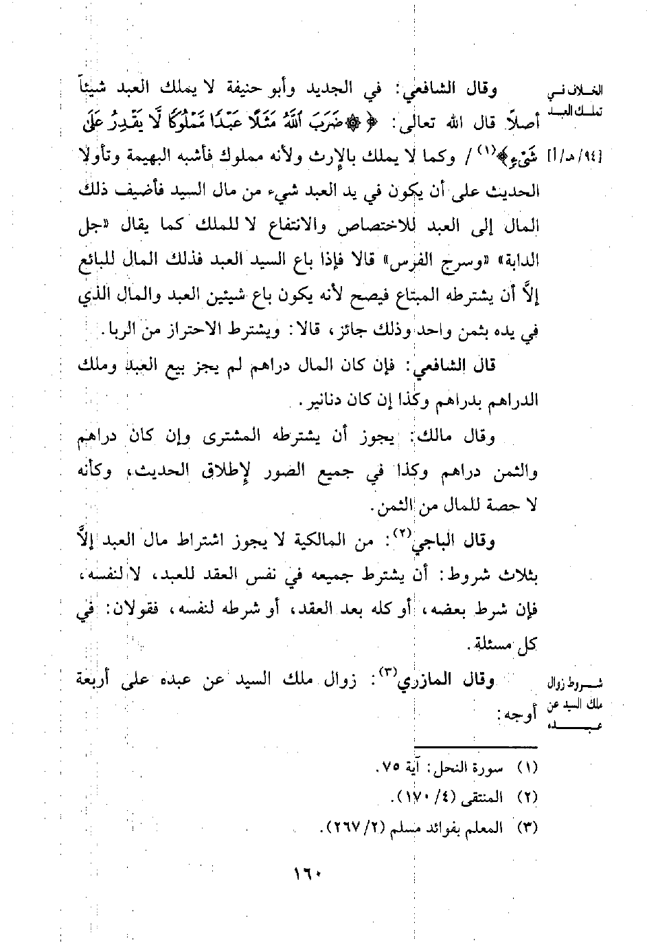 وقال الشافعي: في الجديد وأبو حنيفة لا يملك العبد شيئاً أصلاً قال الله تعالى: {ضَرَبَ اللَّهُ مَثَلًا عَبْدًا مَمْلُوكًا لَا يَقْدِرُ عَلَى شَيْءٍ} (¬1) وكما لا يملك بالإِرث ولأنه مملوك فأشبه البهيمة وتأولا الحديث على أن يكون في يد العبد شيء من مال السيد فأضيف ذلك المال إلى العبد للاختصاص والانتفاع لا للملك كما يقال "جل الدابة" "وسرج الفرس" قالا فإذا باع السيد العبد فذلك المال للبائع إلاَّ أن يشترطه المبتاع فيصح لأنه يكون باع شيئين العبد والمال الذي في يده بثمن واحد وذلك جائز، قالا: ويشترط الاحتراز من الربا.