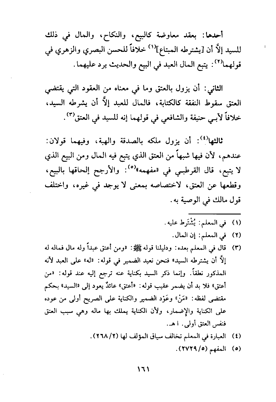 (¬3) قال في المعلم بعده: ودليلنا قوله - صلى الله عليه وسلم -: "ومن أعتق عبداً وله مال فماله له إلاَّ أن يشترطه السيد" فنحن نعيد الضمير في قوله: "له" على العبد لأنه المذكور نطقاً. وإنما ذكر السيد بكناية عنه ترجع إليه عند قوله: "من أعتق" فلا بد أن يضمر عقيب قوله: "أعتق" عاتدٌ يعود إلى "السيد" بحكم مقتضى لفظه: "مَن" وعَوْد الضمير والكناية على الصريح أولى من عوده على الكناية والإِضمار، ولأن الكناية يملك بها ماله وهي سبب العتق فنفس العتق أولى. اهـ.
