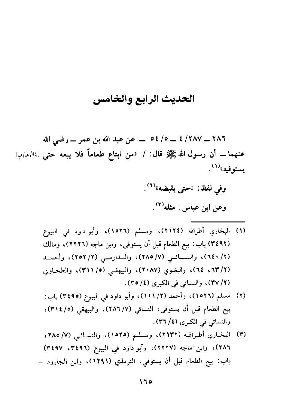 286 - 287/ 4 - 5/ 54 - عن عبد الله بن عمر -رضي الله عنهما- أن رسول الله - صلى الله عليه وسلم - قال: "من ابتاع طعاماً فلا يبعه حتى يستوفيه" (¬1).