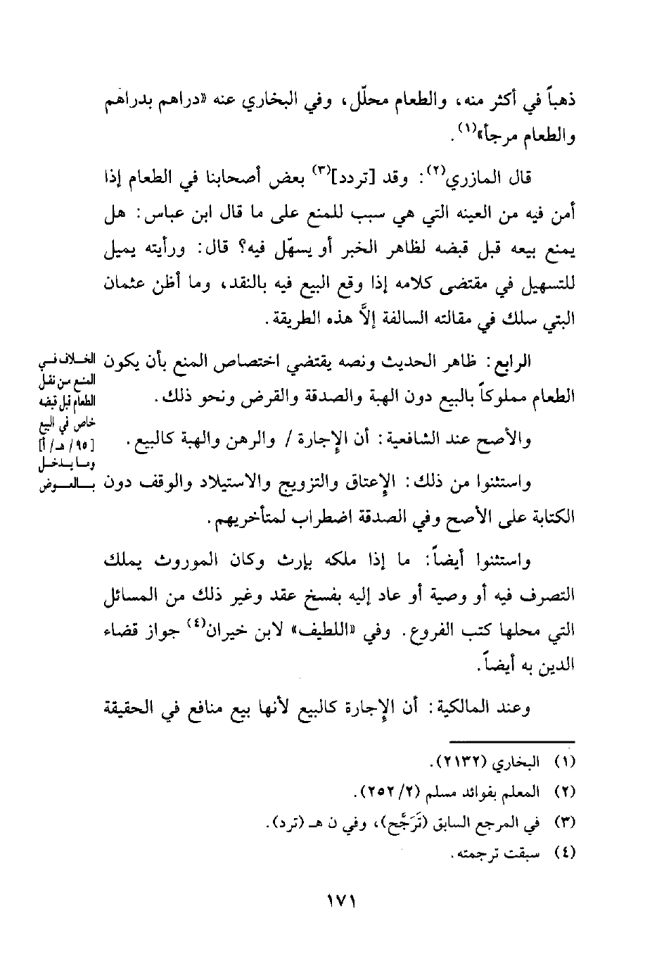قال المازري (¬2): وقد [تردد] (¬3) بعض أصحابنا في الطعام إذا أمن فيه من العينه التي هي سبب للمنع على ما قال ابن عباس: هل يمنع بيعه قبل قبضه لظاهر الخبر أو يسهّل فيه؟ قال: ورأيته يميل للتسهيل في مقتضى كلامه إذا وقع البيع فيه بالنقد، وما أظن عثمان البتي سلك في مقالته السالفة إلاَّ هذه الطريقة.