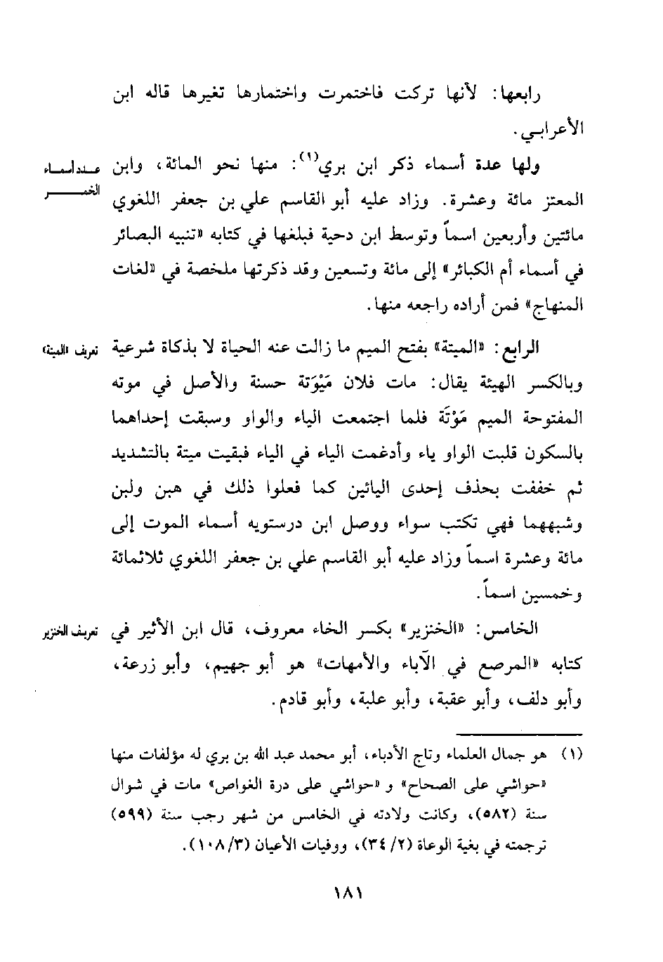 (¬1) هو جمال العلماء وتاج الأدباء، أبو محمد عبد الله بن بري له مؤلفات منها "حواشي على الصحاح" و"حواشي على درة الغواص" مات في شوال سنة (582)، وكانت ولادته في الخامس من شهر رجب سنة (599) ترجمته في بغية الوعاة (2/ 34)، ووفيات الأعيان (3/ 108).