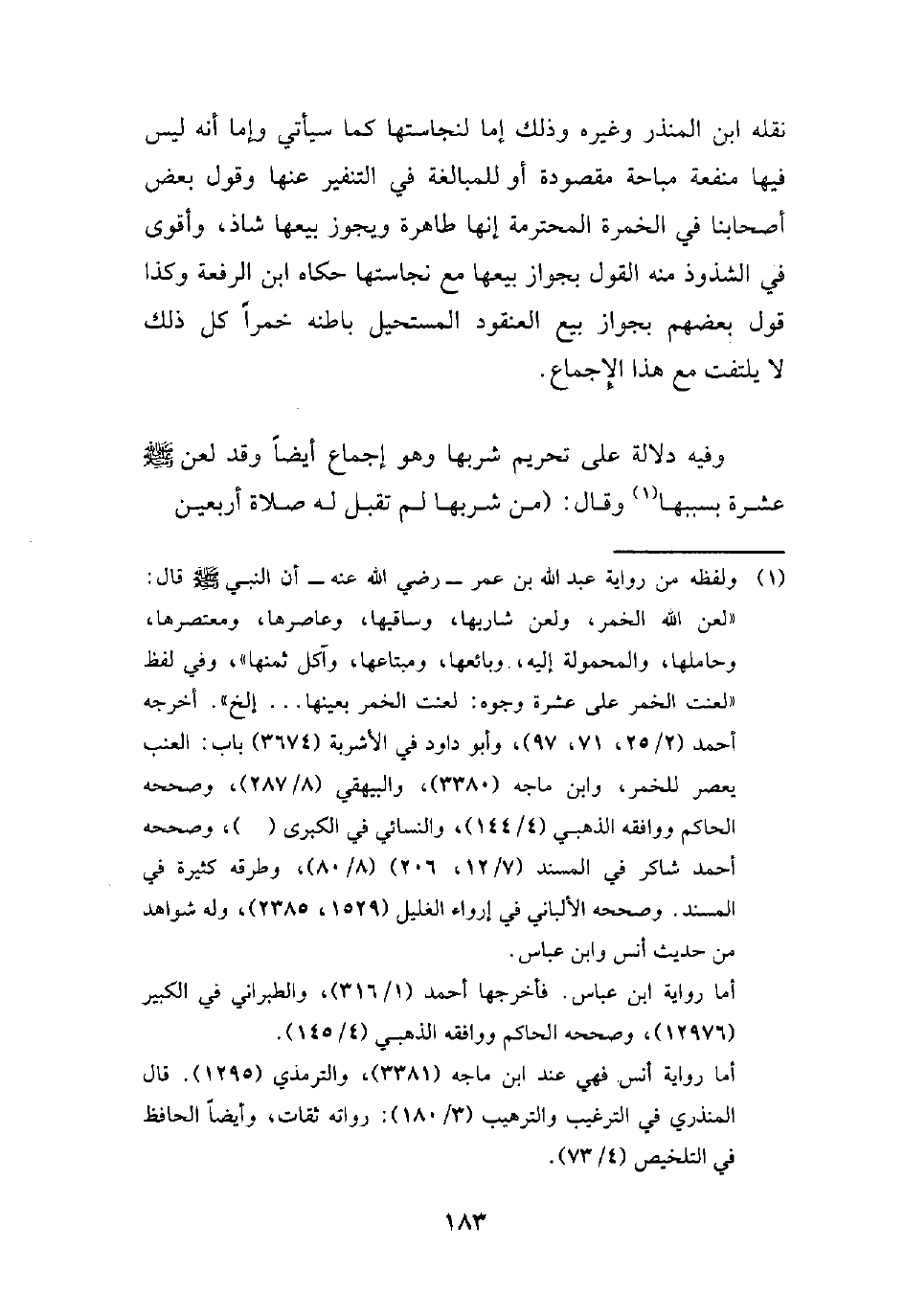 نقله ابن المنذر وغيره وذلك إما لنجاستها كما سيأتي وإما أنه ليس فيها منفعة مباحة مقصودة أو للمبالغة في التنفير عنها وقول بعض أصحابنا في الخمرة المحترمة إنها طاهرة ويجوز بيعها شاذ، وأقوى في الشذوذ منه القول بجواز بيعها مع نجاستها حكاه ابن الرفعة وكذا قول بعضهم بجواز بيع العنقود المستحيل باطنه خمراً كل ذلك لا يلتفت مع هذا الإِجماع.