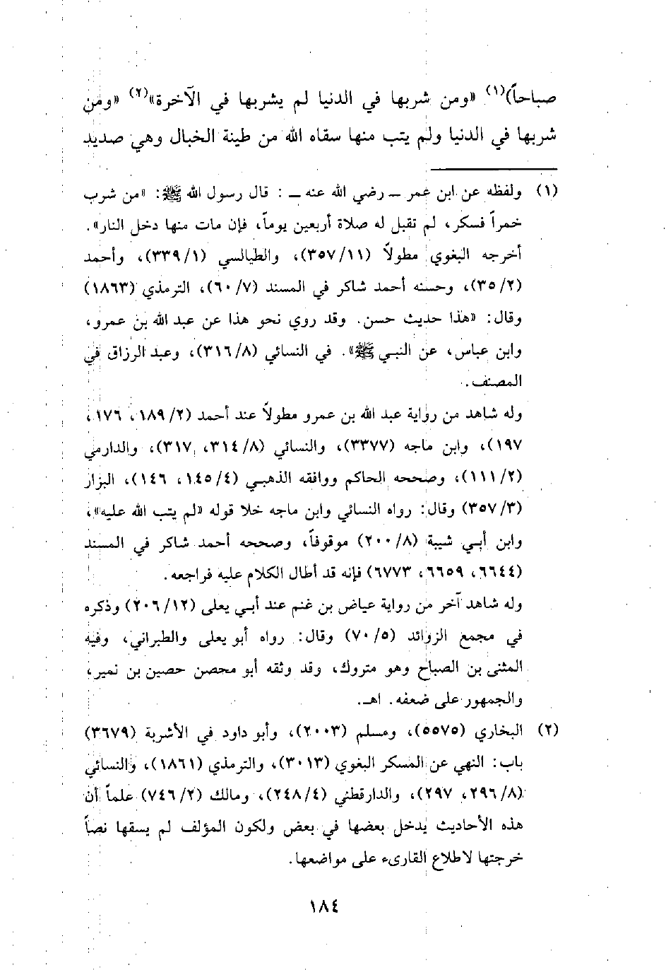(¬2) البخاري (5575)، ومسلم (2003)، وأبو داود في الأشربة (3679) باب: النهي عن المسكر البغوي (3013)، والترمذي (1861)، والنسائي (8/ 296، 297)، والدارقطني (4/ 248)، ومالك (2/ 746) علماً أن هذه الأحاديث يدخل بعضها في بعض ولكون المؤلف لم يسقها نصاً خرجتها لإِطلاع القارىء على مواضعها.