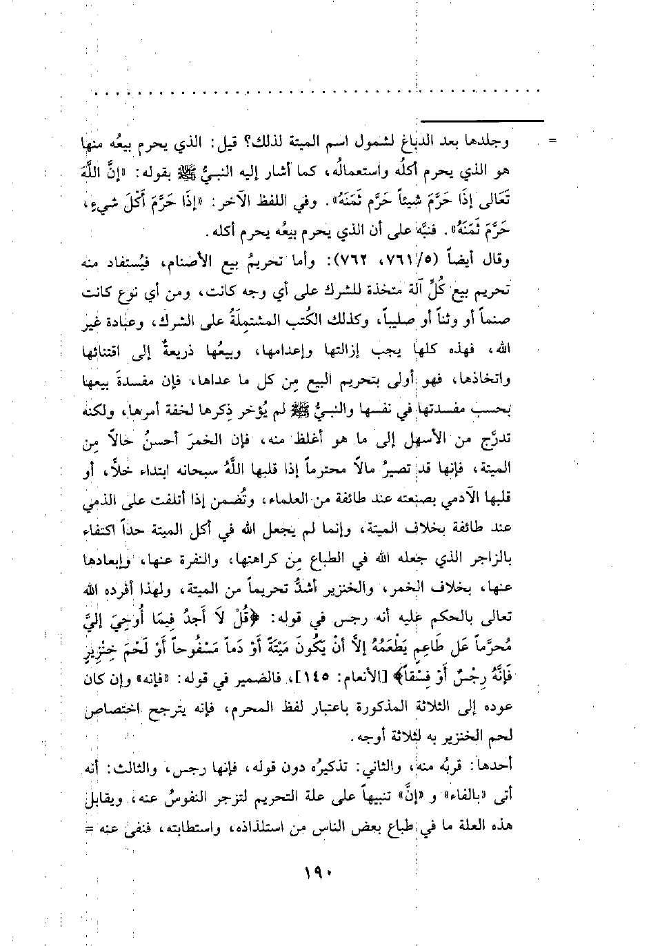 وقال أيضاً (5/ 761، 762): وأما تحريمُ بيع الأصنام، فيُستفاد منه تحريم بيع كُلِّ آلة متخذة للشرك على أي وجه كانت، ومن أي نوع كانت صنماً أو وثناً أو صليباً، وكذلك الكُتب المشتمِلَةُ على الشرك، وعبادة غير الله، فهذه كلها يجب إزالتها وإعدامها، وبيعُها ذريعةٌ إلى اقتنائها واتخاذها، فهو أولى بتحريم البيع مِن كل ما عداها، فإن مفسدةَ بيعها بحسب مفسدتها في نفسها والنبيُّ - صلى الله عليه وسلم - لم يُؤخر ذِكرها لخفة أمرها, ولكنه تدرَّج من الأسهل إلى ما هو أغلظ منه، فإن الخمرَ أحسنُ حالاً مِن الميتة، فإنها قد تصيرُ مالاً محترماً إذا قلبها اللهُ سبحانه ابتداء خلاَّ، أو قلبها الآدمي بصنعته عند طائفة من العلماء، وتُضمن إذا أتلفت على الذمي عند طائفة بخلاف الميتة، وإنما لم يجعل الله في أكل الميتة حداً اكتفاء بالزاجر الذي جعله الله في الطباع مِن كراهتها، والنفرة عنها، وإبعادها عنها، بخلاف الخمر، والخنزير أشدُّ تحريماً من الميتة، ولهذا أفرده الله تعالى بالحكم عليه أنه رجس في قوله: {قُلْ لَا أَجِدُ فِي مَا أُوحِيَ إِلَيَّ مُحَرَّمًا عَلَى طَاعِمٍ يَطْعَمُهُ إِلَّا أَنْ يَكُونَ مَيْتَةً أَوْ دَمًا مَسْفُوحًا أَوْ لَحْمَ خِنْزِيرٍ فَإِنَّهُ رِجْسٌ أَوْ فِسْقًا} [الأنعام: 145]، فالضمير في قوله: "فإنه" وإن كان عوده إلى الثلاثة المذكورة باعتبار لفظ المحرم، فإنه يترجح اختصاص لحم الخنزير به لثلاثة أوجه.