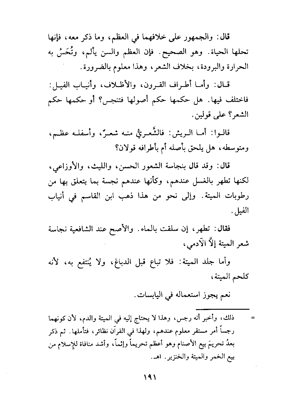 قال: وقد قال بنجاسة الشعور الحسن، والليث، والأوزاعي، لكنها تطهر بالغسل عندهم , وكأنها عندهم نجسة بما يتعلق بها من رطوبات الميتة. وإلى نحو من هذا ذهب ابن القاسم في أنياب الفيل.