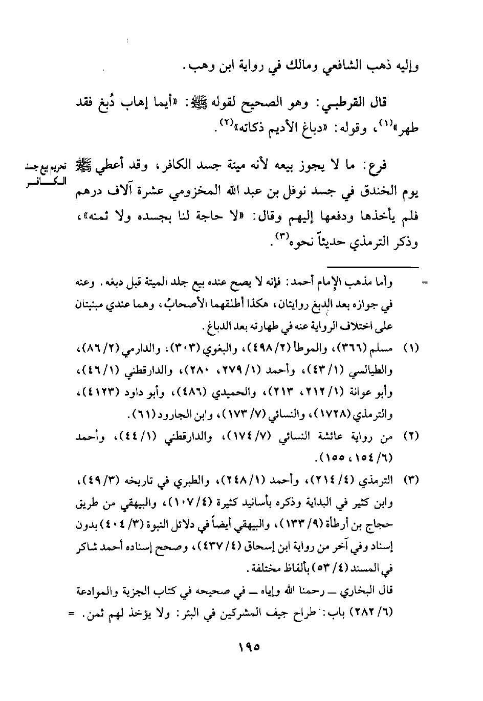 فرع: ما لا يجوز بيعه لأنه ميتة جسد الكافر، وقد أعطي - صلى الله عليه وسلم - يوم الخندق في جسد نوفل بن عبد الله المخزومي عشرة آلاف درهم فلم يأخذها ودفعها إليهم وقال: "لا حاجة لنا بجسده ولا ثمنه"، وذكر الترمذي حديثاً نحوه (¬3).