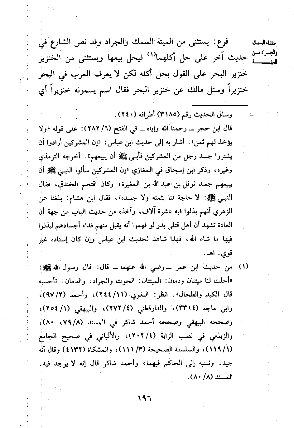 (¬1) من حديث ابن عمر -رضي الله عنهما- قال: قال رسول الله - صلى الله عليه وسلم -: "أحلت لنا ميتتان ودمان: الميتتان: الحوت والجراد، والدمان: "أحسبه قال الكبد والطحال". انظر: البغوي (11/ 244)، وأحمد (2/ 97)، وابن ماجه (3314)، والدارقطني (4/ 272)، والبيهقي (1/ 254)، وصححه البيهقي وصححه أحمد شاكر في المسند (8/ 79، 80)، والزيلعي في نصب الراية (4/ 202) ,والألباني في صحيح الجامع (1/ 119)، والسلسلة الصحيحة (3/ 111)، والمشكاة (4132) وقال أنه جيد. ونسبه إلى الحاكم فيهما، وأحمد شاكر قال إنه لا يوجد فيه. المسند (8/ 80).
