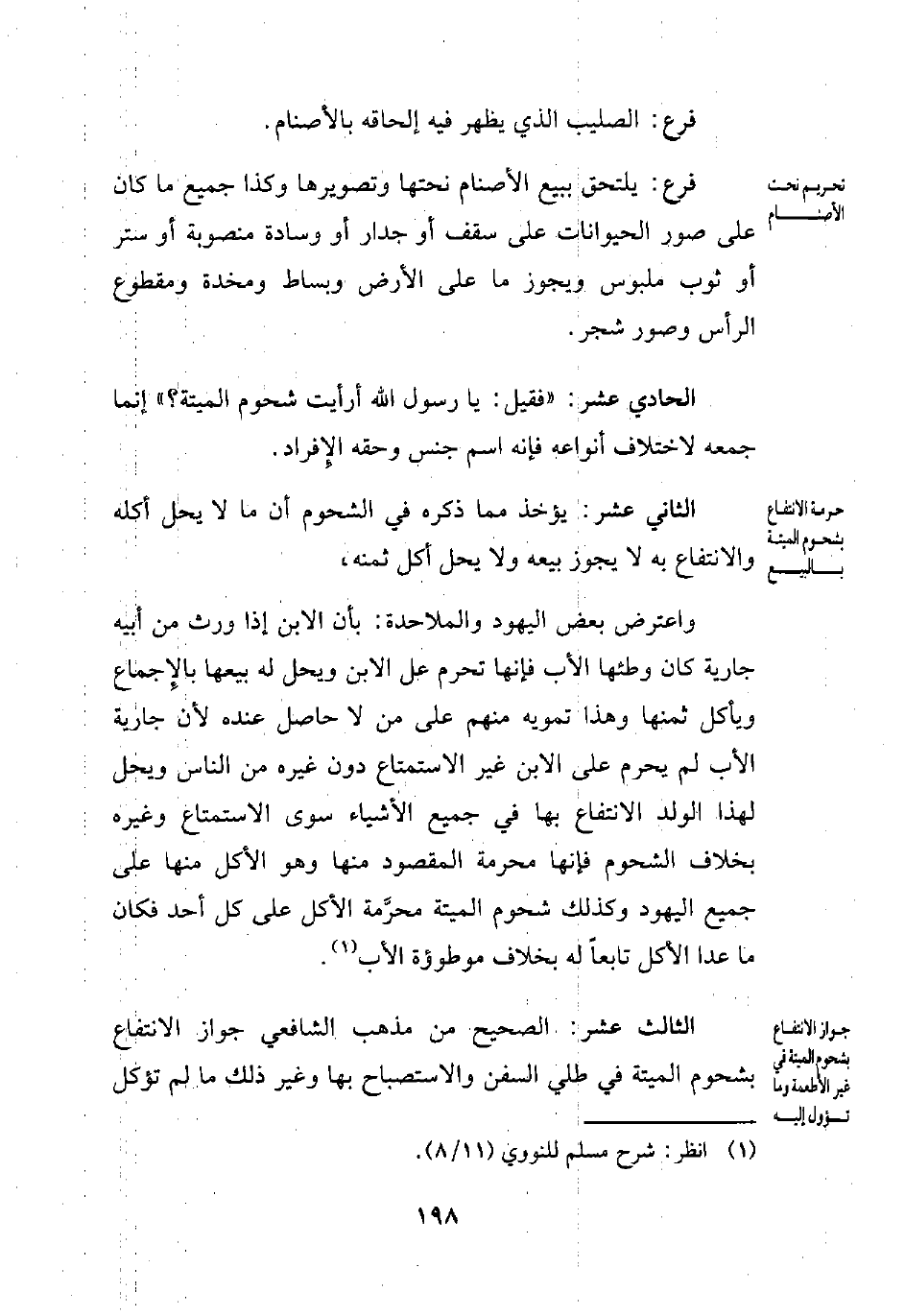 فرع: يلتحق ببيع الأصنام نحتها وتصويرها وكذا جميع ما كان على صور الحيوانات على سقف أو جدار أو وسادة منصوبة أو ستر أو ثوب ملبوس ويجوز ما على الأرض وبساط ومخدة ومقطوع الرأس وصور شجر.