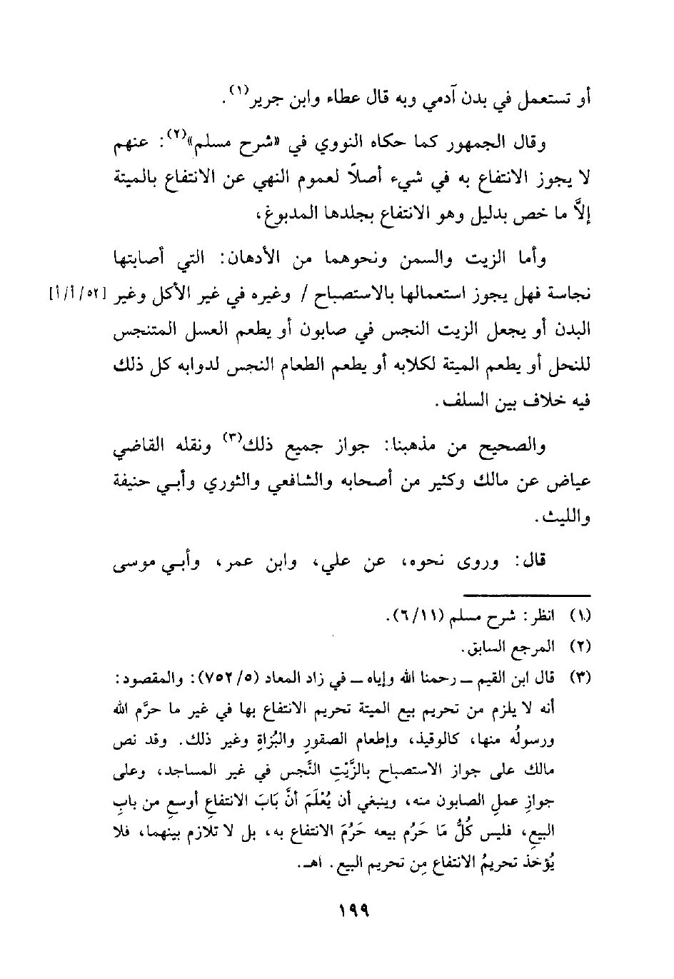(¬3) قال ابن القيم -رحمنا الله وإياه- في زاد المعاد (5/ 752): والمقصود: أنه لا يلزم من تحريم بيع الميتة تحريم الانتفاع بها في غير ما حرَّم الله ورسولُه منها، كالوقيذ، وإطعام الصقورِ والبُزاةِ وغير ذلك. وقد نص مالك على جواز الاستصباح بالزَّيْتِ النَّجس في غير المساجد، وعلى جوازِ عملِ الصابون منه، وينبغي أن يُعْلَمَ أنَّ بَابَ الانتفاعِ أوسعِ من بابِ البيعِ، فليس كُلُّ مَا حَرُم بيعه حَرُمَ الانتفاع به، بل لا تلازم بينهما، فلا يُؤخذ تحريمُ الانتفاع مِن تحريم البيع. اهـ.