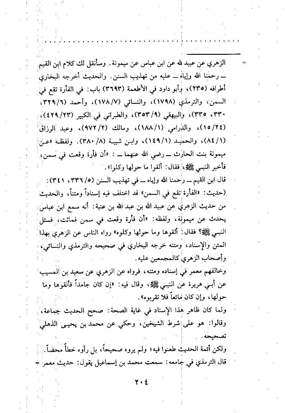 = الزهري عن عبيد الله عن ابن عباس عن ميمونة. وسأنقل لك كلام ابن القيم -رحمنا الله وإياه- عليه من تهذيب السنن. والحديث أخرجه اليخاري أطرافه (235)، وأبو داود في الأطعمة (3693) باب. في الفأرة تقع في السمن، والترمذي (1798)، والنسائي (7/ 178)، وأحمد (6/ 329، 330، 335)، والبيهقي (9/ 353)، والطبراني في الكبير (23/ 429)، (24/ 15)، والدرامي (1/ 188)، ومالك (2/ 972)، وعبد الرزاق (1/ 84)، والحميد (1/ 149)، وابن شيبة (8/ 380). ولفظه "عن ميمونة بنت الحارث -رضي الله عنهما-: "أن فأرة وقعت في سمن، فأخبر النبي - صلى الله عليه وسلم -، فقال: ألقوا ما حولها وكلوا".