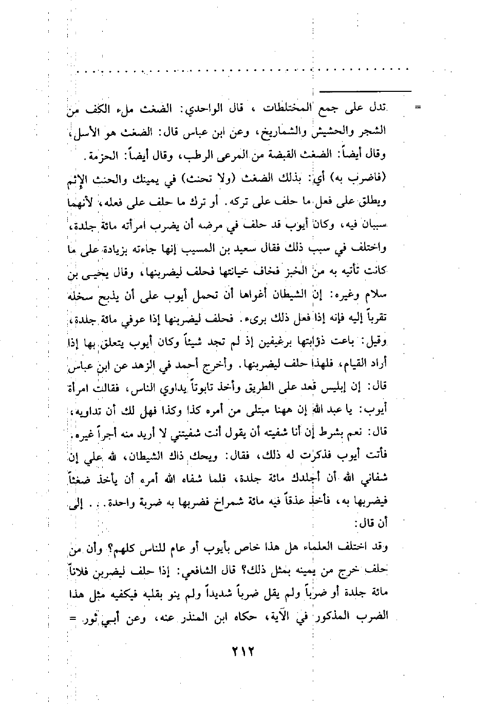 وقد اختلف العلماء هل هذا خاص بأيوب أو عام للناس كلهم؟ وأن من حلف خرج من يمينه بمثل ذلك؟ قال الشافعي: إذا حلف ليضربن فلاناً مائة جلدة أو ضرباً ولم يقل ضرباً شديداً ولم ينو بقلبه فيكفيه مثل هذا الضرب المذكور في الآية، حكاه ابن المنذر عنه، وعن أبي ثور =