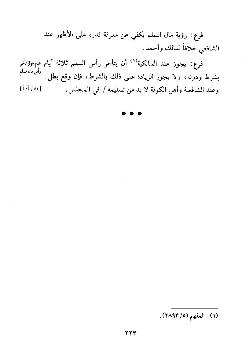 فرع: يجوز عند المالكية (¬1) أن يتأخر رأس السلم ثلاثة أيام بشرط ودونه، ولا يجوز الزيادة على ذلك بالشرط، فإن وقع بطل.