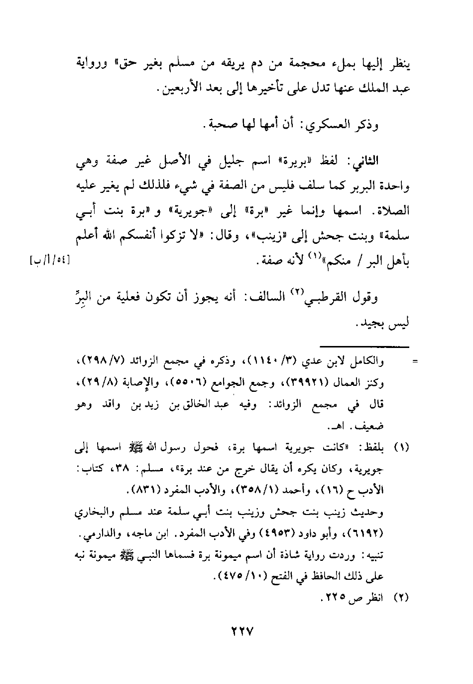 (¬1) بلفظ: "كانت جويرية اسمها برة، فحول رسول الله - صلى الله عليه وسلم - اسمها إلى جويرية، وكان يكره أن يقال خرج من عند برة"، مسلم: 38، كتاب: الأدب ح (16)، وأحمد (1/ 358)، والأدب المفرد (831).