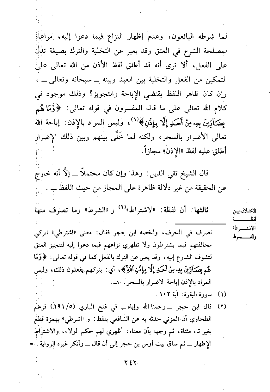 = تصرف في الحرف، ولخصه ابن حجر فقال: معنى "اشترطي" اتركي مخالفتهم فيما يشترطون ولا تظهري نزاعهم فيما دعوا إليه لتنجيز العتق لتشوف الشارع إليه، وقد يعبر عن الترك بالفعل كما في قوله تعالى: {وَمَا هُمْ بِضَارِّينَ بِهِ مِنْ أَحَدٍ إِلَّا بِإِذْنِ اللَّهِ}، أي: بتركهم يفعلون ذلك، وليس المراد بالإِذن إباحة الإضرار بالسحر. اهـ.