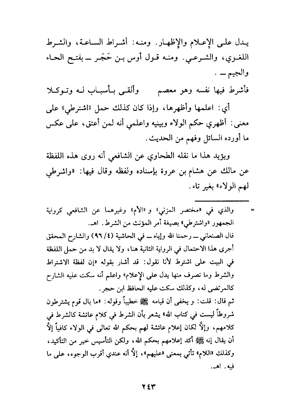 قال الصنعاني -رحمنا الله وإياه- في الحاشية (4/ 96) والشارح المحقق أجرى هذا الاحتمال في الرواية الثانية هنا, ولا يقال لا بد من حمل اللفظة في البيت على اشترط لأنا نقول: قد أشار بقوله "إن لفظة الاشتراط والشرط وما تصرف منها يدل على الإِعلام" واعلم أنه سكت عليه الشارح كالمرتضى له، وكذلك سكت عليه الحافظ ابن حجر.