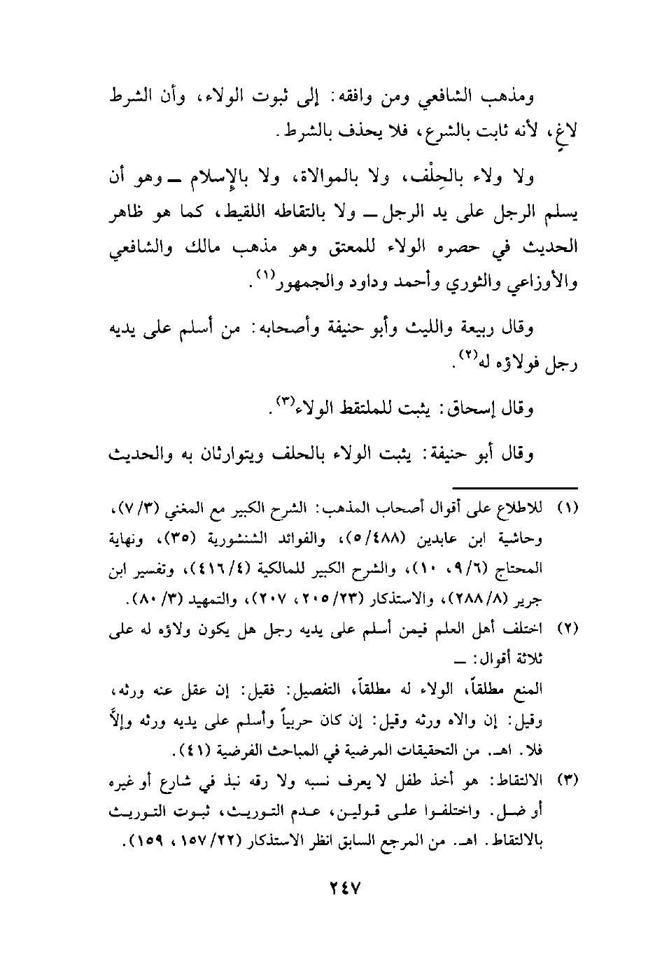 ولا ولاء بالحِلْف، ولا بالموالاة، ولا بالإِسلام -وهو أن يسلم الرجل على يد الرجل- ولا بالتقاطه اللقيط، كما هو ظاهر الحديث في حصره الولاء للمعتق وهو مذهب مالك والشافعي والأوزاعي والثوري وأحمد وداود والجمهور (¬1).