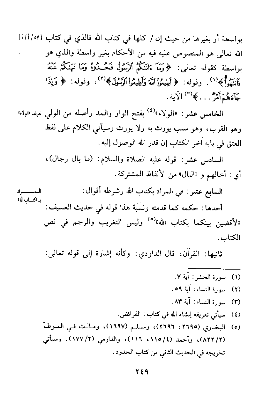 بواسطة أو بغيرها من حيث إن كلها في كتاب الله فالذي في كتاب الله تعالى هو المنصوص عليه فيه من الأحكام بغير واسطة والذي هو بواسطة كقوله تعالى: {وَمَا آتَاكُمُ الرَّسُولُ فَخُذُوهُ وَمَا نَهَاكُمْ عَنْهُ فَانْتَهُوا} (¬1). وقوله: {أَطِيعُوا اللَّهَ وَأَطِيعُوا الرَّسُولَ} (¬2)، وقوله: {وَإِذَا جَاءَهُمْ أَمْرٌ ...} (¬3) الآية.