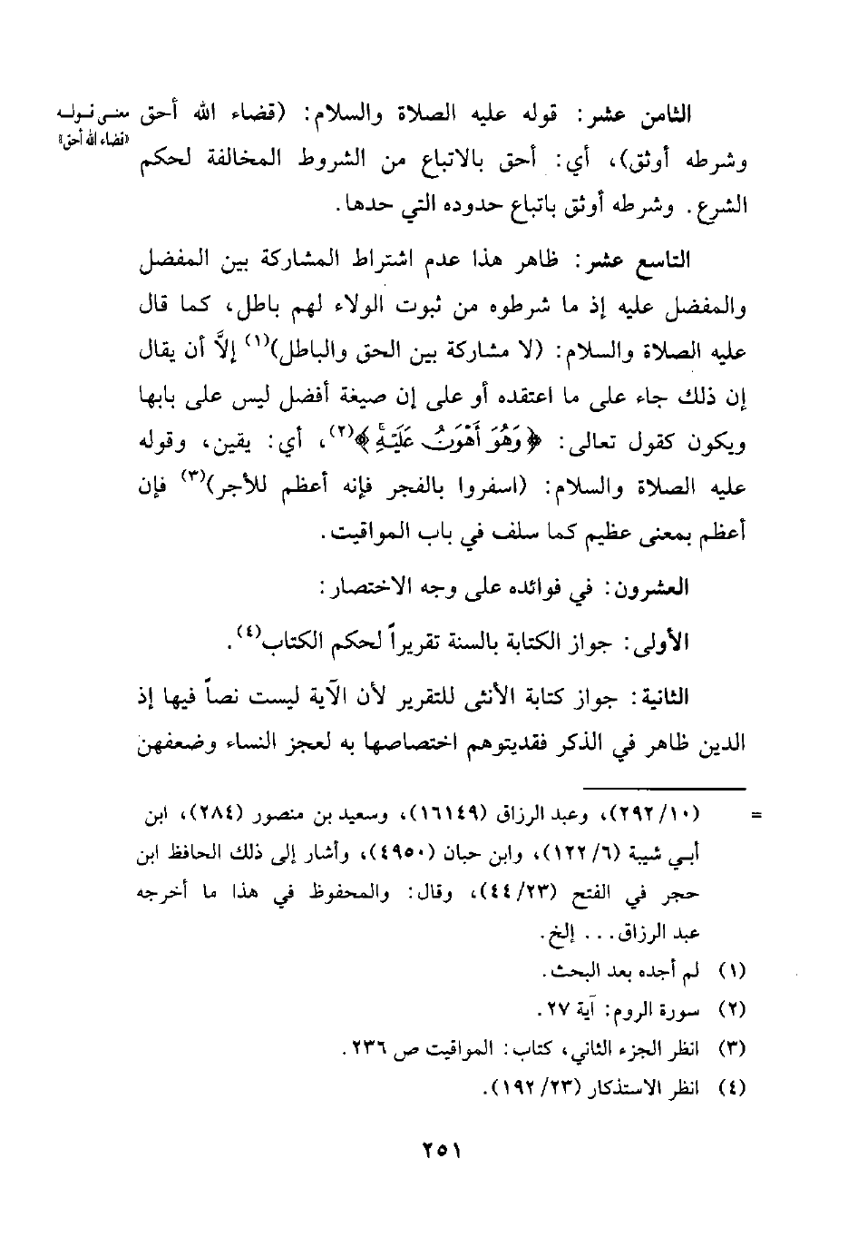 التاسع عشر: ظاهر هذا عدم اشتراط المشاركة بين المفضل والمفضل عليه إذ ما شرطوه من ثبوت الولاء لهم باطل، كما قال -عليه الصلاة والسلام-: (لا مشاركة بين الحق والباطل) (¬1) إلاَّ أن يقال إن ذلك جاء على ما اعتقده أو على إن صيغة أفضل ليس على بابها ويكون كقول تعالى: {وَهُوَ أَهْوَنُ عَلَيْهِ} (¬2)، أي: يقين، وقوله -عليه الصلاة والسلام-: (اسفروا بالفجر فإنه أعظم للأجر) (¬3) فإن أعظم بمعنى عظيم كما سلف في باب المواقيت.