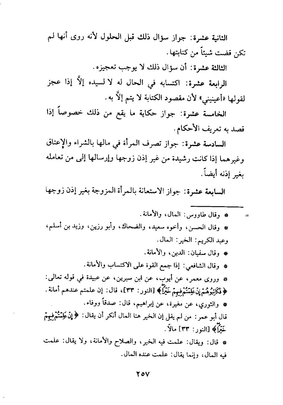 السادسة عشرة: جواز تصرف المرأة في مالها بالشراء والإِعتاق وغيرهما إذا كانت رشيدة من غير إذن زوجها وإرسالها إلى من تعامله بغير إذنه أيضاً.