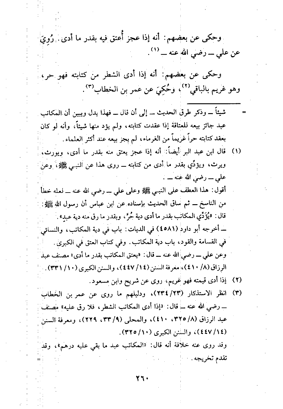أقول: هذا العطف على النبي - صلى الله عليه وسلم - وعلى علي -رضي الله عنه- لعله خطأ من الناسخ- ثم ساق الحديث بإسناده عن ابن عباس أن رسول الله - صلى الله عليه وسلم -: قال: "يُؤَدَّي المكاتب بقدر ما أدى دية حُرَّ، وبقدر ما رق منه دية عبدٍ".
