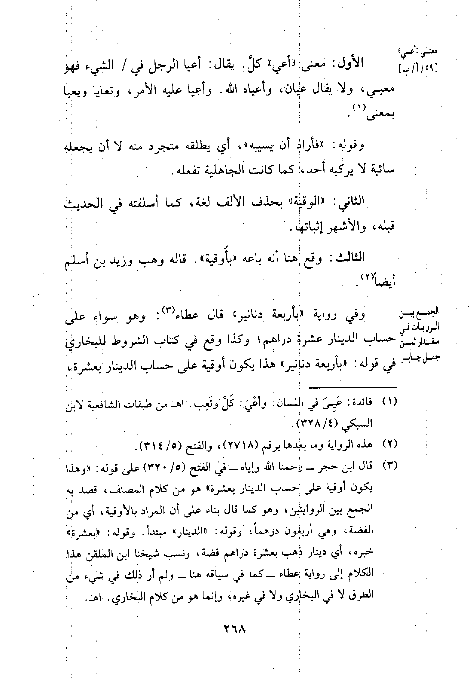 (¬3) قال ابن حجر-رحمنا الله وإياه- في الفتح (5/ 320) على قوله: "وهذا يكون أوقية على حساب الدينار بعشرة" هو من كلام المصنف، قصد به الجمع بين الروايتين، وهو كما قال بناء على أن المراد بالأوقية، أي من الفضة، وهي أربعون درهماً، وقوله: "الدينار" مبتدأ. وقوله: "بعشرة" خبره، أي دينار ذهب بعشرة دراهم فضة، ونسب شيخنا ابن الملقن هذا الكلام إلى رواية عطاء -كما في سياقه هنا- ولم أر ذلك في شيء من الطرق لا في البخاري ولا في غيره، وإنما هو من كلام البخاري. اهـ.