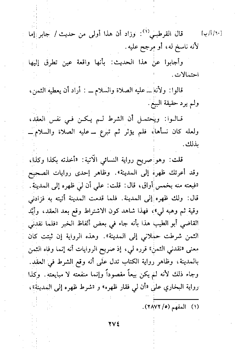 قال: ولك ظهره إلى المدينة. فلما قدمت المدينة أتيته به فزادني وقية ثم وهبه لي"، فهذا شاهد كون الاشتراط وقع بعد العقد، وأيَّد القاضي أبو الطيب هذا بأنه جاء في بعض ألفاظ الخبر "فلما نقدني الثمن شرطت حملاني إلى المدينة". وهذه الرواية إن ثبتت كان معنى "نقدني الثمن" قرره لي، إذ صريح الروايات أنه إنما وفاه الثمن بالمدينة، وظاهر رواية الكتاب تدل على أنه وقع الشرط في العقد. وجاء ذلك لأنه لم يكن بيعاً مقصوداً وإنما منفعته لا مبايعته. وكذا رواية البخاري على "أن لي فقار ظهره" و"شرط ظهره إلى المدينة"،
