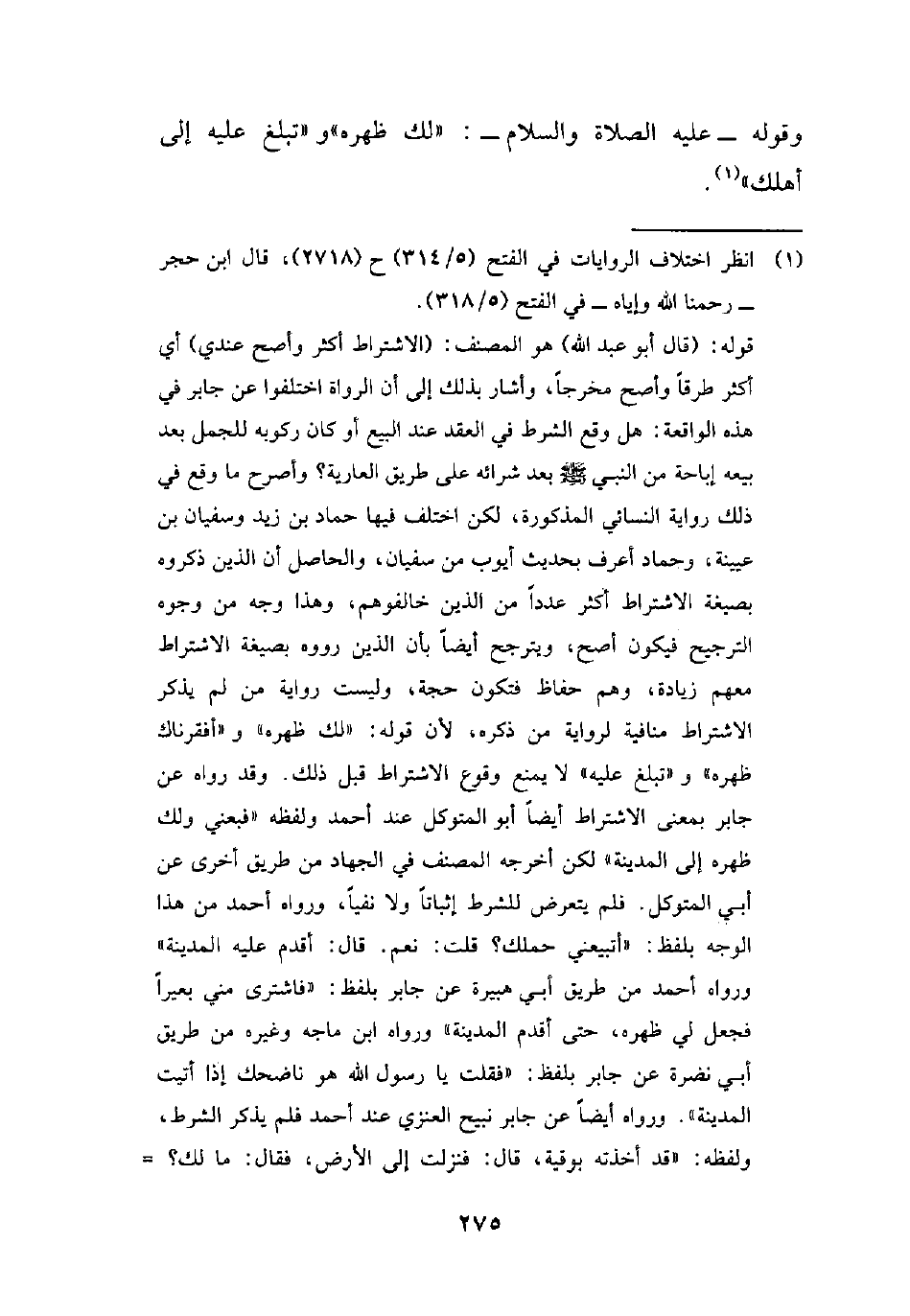قوله: (قال أبو عبد الله) هو المصنف: (الاشتراط أكثر وأصح عندي) أي أكثر طرقاً وأصح مخرجاً، وأشار بذلك إلى أن الرواة اختلفوا عن جابر في هذه الواقعة: هل وقع الشرط في العقد عند البيع أو كان ركوبه للجمل بعد بيعه إباحة من النبي - صلى الله عليه وسلم - بعد شرائه على طريق العارية؟ وأصرح ما وقع في ذلك رواية النسائي المذكورة، لكن اختلف فيها حماد بن زيد وسفيان بن عيينة، وحماد أعرف بحديث أيوب من سفيان، والحاصل أن الذين ذكروه بصيغة الاشتراط أكثر عدداً من الذين خالفوهم، وهذا وجه من وجوه الترجيح فيكون أصح، ويترجح أيضاً بأن الذين رووه بصيغة الاشتراط معهم زيادة، وهم حفاظ فتكون حجة، وليست رواية من لم يذكر الاشتراط منافية لرواية من ذكره, لأن قوله: "لك ظهره" و"أفقرناك ظهره" و"تبلغ عليه" لا يمنع وقوع الاشتراط قبل ذلك. وقد رواه عن جابر بمعنى الاشتراط أيضاً أبو المتوكل عند أحمد ولفظه "فبعني ولك ظهره إلى المدينة" لكن أخرجه المصنف في الجهاد من طريق أخرى عن أبي المتوكل. فلم يتعرض للشرط إثباتاً ولا نفياً، ورواه أحمد من هذا الوجه بلفظ: "أتبيعني حملك؟ قلت: نعم. قال: أقدم عليه المدينة" ورواه أحمد من طريق أبي هبيرة عن جابر بلفظ: "فاشترى مني بعيراً فجعل لي ظهره، حتى أقدم المدينة" ورواه ابن ماجه وغيره من طريق أبي نضرة عن جابر بلفظ: "فقلت يا رسول الله هو ناضحك إذا أتيت المدينة". ورواه أيضاً عن جابر نبيح العنزي عند أحمد فلم يذكر الشرط، ولفظه: "قد أخذته بوقية، قال: فنزلت إلى الأرض، فقال: ما لك؟ =