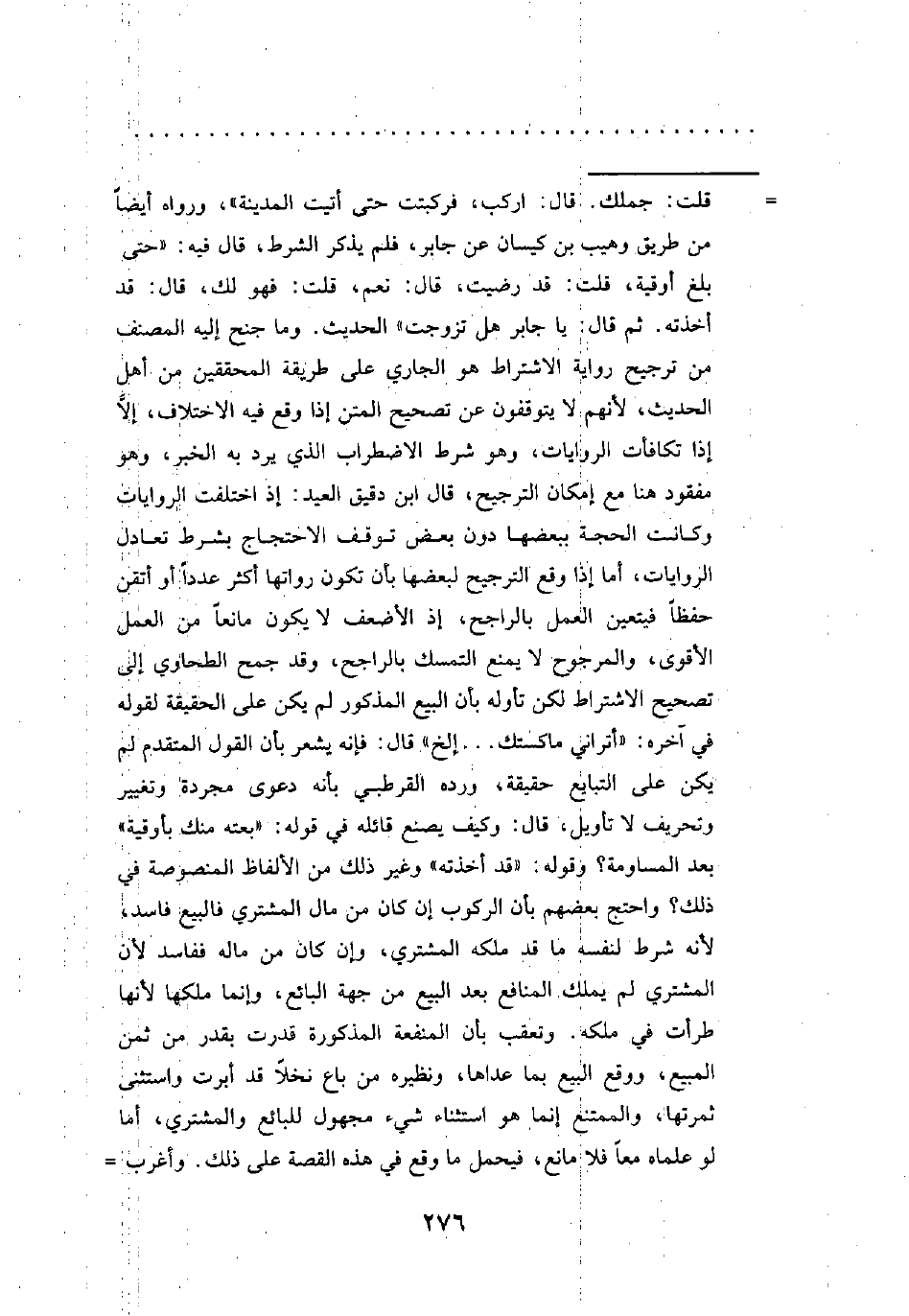 = قلت: جملك. قال: اركب، فركبتت حتى أتيت المدينة"، ورواه أيضاً من طريق وهيب بن كيسان عن جابر، فلم يذكر الشرط، قال فيه: "حتى بلغ أوقية، قلت: قد رضيت، قال: نعم، قلت: فهو لك، قال: قد أخذته. ثم قال: يا جابر هل تزوجت" الحديث. وما جنح إليه المصنف من ترجيح رواية الاشتراط هو الجاري على طريقة المحققين من أهل الحديث، لأنهم لا يتوقفون عن تصحيح المتن إذا وقع فيه الاختلاف، إلاَّ إذا تكافأت الروايات، وهو شرط الاضطراب الذي يرد به الخبر، وهو مفقود هنا مع إمكان الترجيح، قال ابن دقيق العيد: إذ اختلفت الروايات وكانت الحجة ببعضها دون بعض توقف الاحتجاج بشرط تعادل الروايات، أما إذا وقع الترجيح لبعضها بأن تكون رواتها أكثر عدداً أو أتقن حفظاً فيتعين العمل بالراجح، إذ الأضعف لا يكون مانعاً من العمل الأقوى، والمرجوح لا يمنع التمسك بالراجح، وقد جمح الطحاوي إلى تصحيح الاشتراط لكن تأوله بأن البيع المذكور لم يكن على الحقيقة لقوله في آخره: "أتراني ماكستك ... إلخ" قال: فإنه يشعر بأن القول المتقدم لم يكن على التبايع حقيقة، ورده القرطبي بأنه دعوى مجردة وتغيير وتحريف لا تأويل، قال: وكيف يصنع قائله في قوله: "بعته منك بأُوقية" بعد المساومة؟ وقوله: "قد أخذته" وغير ذلك من الألفاظ المنصوصة في ذلك؟ واحتج بعضهم بأن الركوب إن كان من مال المشتري فالبيع فاسد، لأنه شرط لنفسه ما قد ملكه المشتري، وإن كان من ماله ففاسد، لأن المشتري لم يملك المنافع بعد البيع من جهة البائع، وإنما ملكها لأنها طرأت في ملكه. وتعقب بأن المنفعة المذكورة قدرت بقدر من ثمن المبيع، ووقع البيع بما عداها، ونظيره من باع نخلاً قد أبرت واستثنى ثمرتها، والممتنع إنما هو استثناء شيء مجهول للبائع والمشتري، أما لو علماه معاً فلا مانع، فيحمل ما وقع في هذه القصة على ذلك. وأغرب =