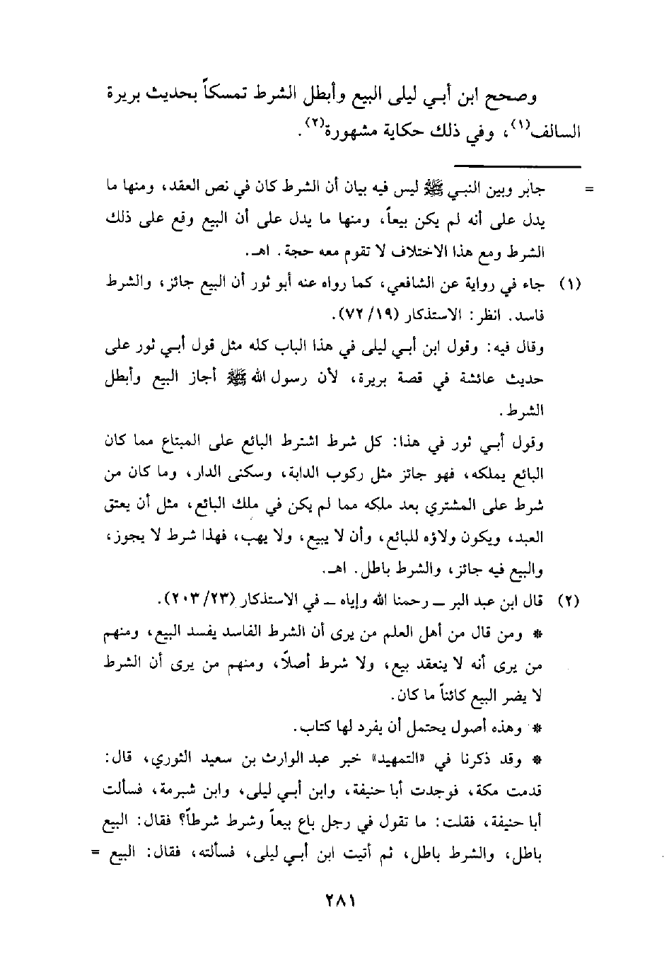 وقال فيه: وقول ابن أبي ليلى في هذا الباب كله مثل قول أبي ثور على حديث عائشة في قصة بريرة، لأن رسول الله - صلى الله عليه وسلم - أجاز البيع وأبطل الشرط.