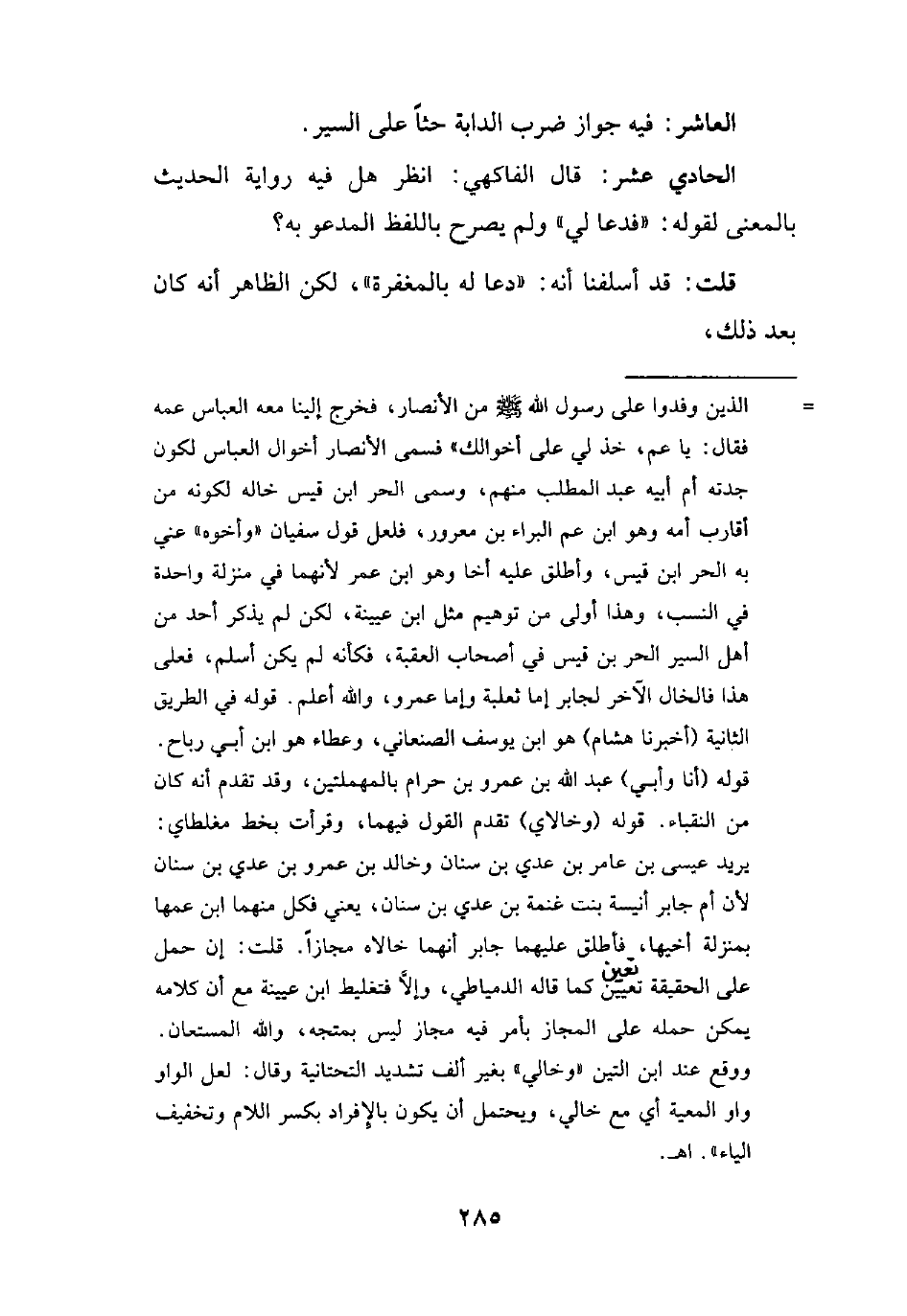 = الذين وفدوا على رسول الله - صلى الله عليه وسلم - من الأنصار، فخرج إلينا معه العباس عمه فقال: يا عم، خذ لي على أخوالك" فسمى الأنصار أخوال العباس لكون جدته أم أبيه عبد المطلب منهم، وسمى الحر ابن قيس خاله لكونه من أقارب أمه وهو ابن عم البراء بن معرور، فلعل قول سفيان "وأخوه" عني به الحر ابن قيس، وأطلق عليه أخا وهو ابن عمر لأنهما في منزلة واحدة في النسب، وهذا أولى من توهيم مثل ابن عيينة، لكن لم يذكر أحد من أهل السير الحر بن قيس في أصحاب العقبة، فكأنه لم يكن أسلم، فعلى هذا فالخال الآخر لجابر إما ثعلبة وإما عمرو، والله أعلم. قوله في الطريق الثانية (أخبرنا هشام) هو ابن يوسف الصنعاني، وعطاء هو ابن أبي رباح.