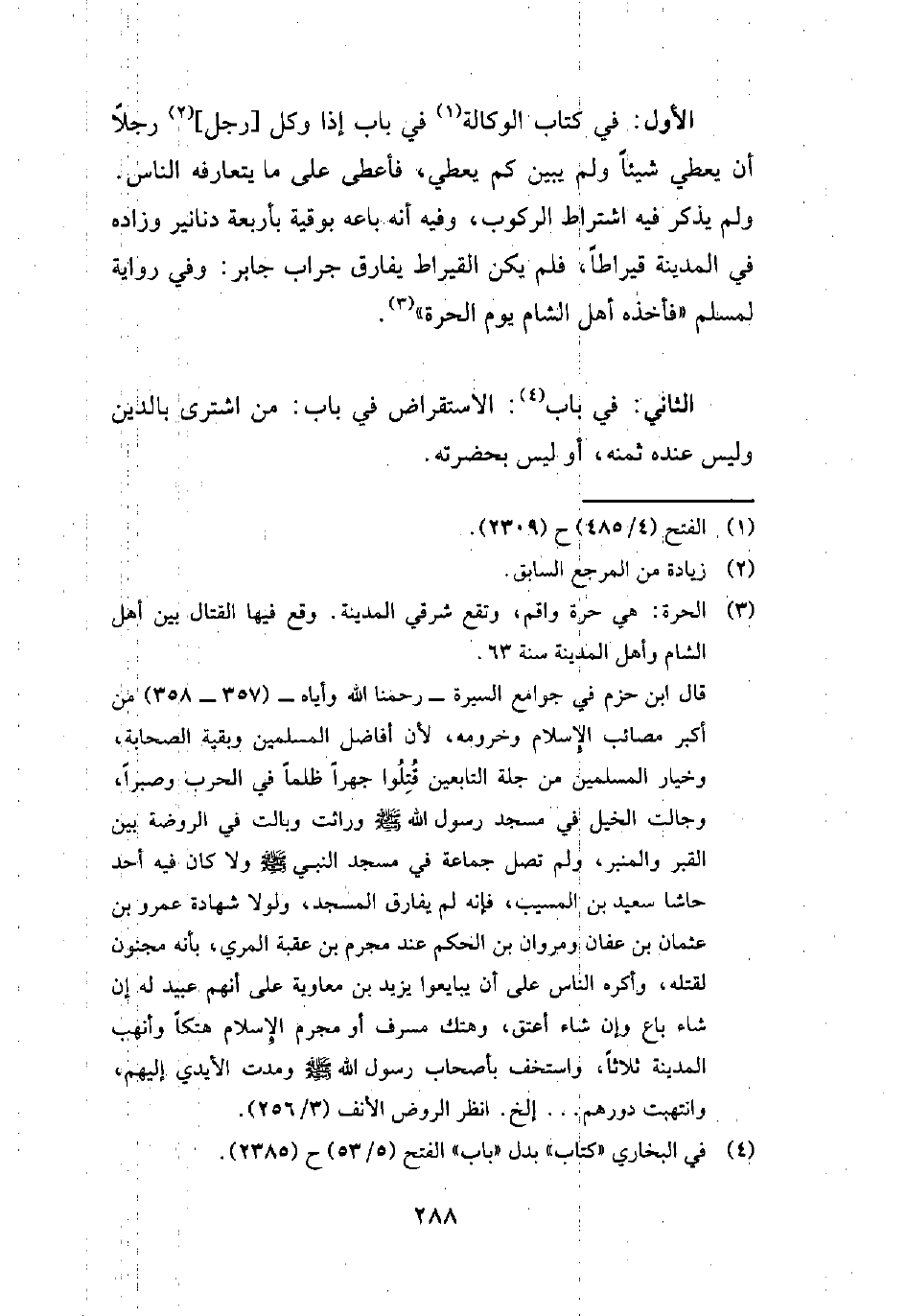 قال ابن حزم في جوامع السيرة -رحمنا الله وإياه- (357 - 358) من أكبر مصائب الإِسلام وخرومه، لأن أفاضل المسلمين وبقية الصحابة، وخيار المسلمين من جلة التابعين قُتِلُوا جهراً ظلماً في الحرب وصبراً، وجالت الخيل في مسجد رسول الله - صلى الله عليه وسلم - وراثت وبالت في الروضة بين القبر والمنبر، ولم تصل جماعة في مسجد النبي - صلى الله عليه وسلم - ولا كان فيه أحد حاشا سعيد بن المسيب، فإنه لم يفارق المسجد، ولولا شهادة عمرو بن عثمان بن عفان ومروان بن الحكم عند مجرم بن عقبة المري، بأنه مجنون لقتله، وأكره الناس على أن يبايعوا يزيد بن معاوية على أنهم عبيد له إن شاء باع وإن شاء أعتق، وهل مسرف أو مجرم الإِسلام هتكاً وأنهب المدينة ثلاثاً، واستخف بأصحاب رسول الله - صلى الله عليه وسلم - ومدت الأيدي إليهم، وانتهبت دورهم ... إلخ. انظر الروض الأنف (3/ 256).