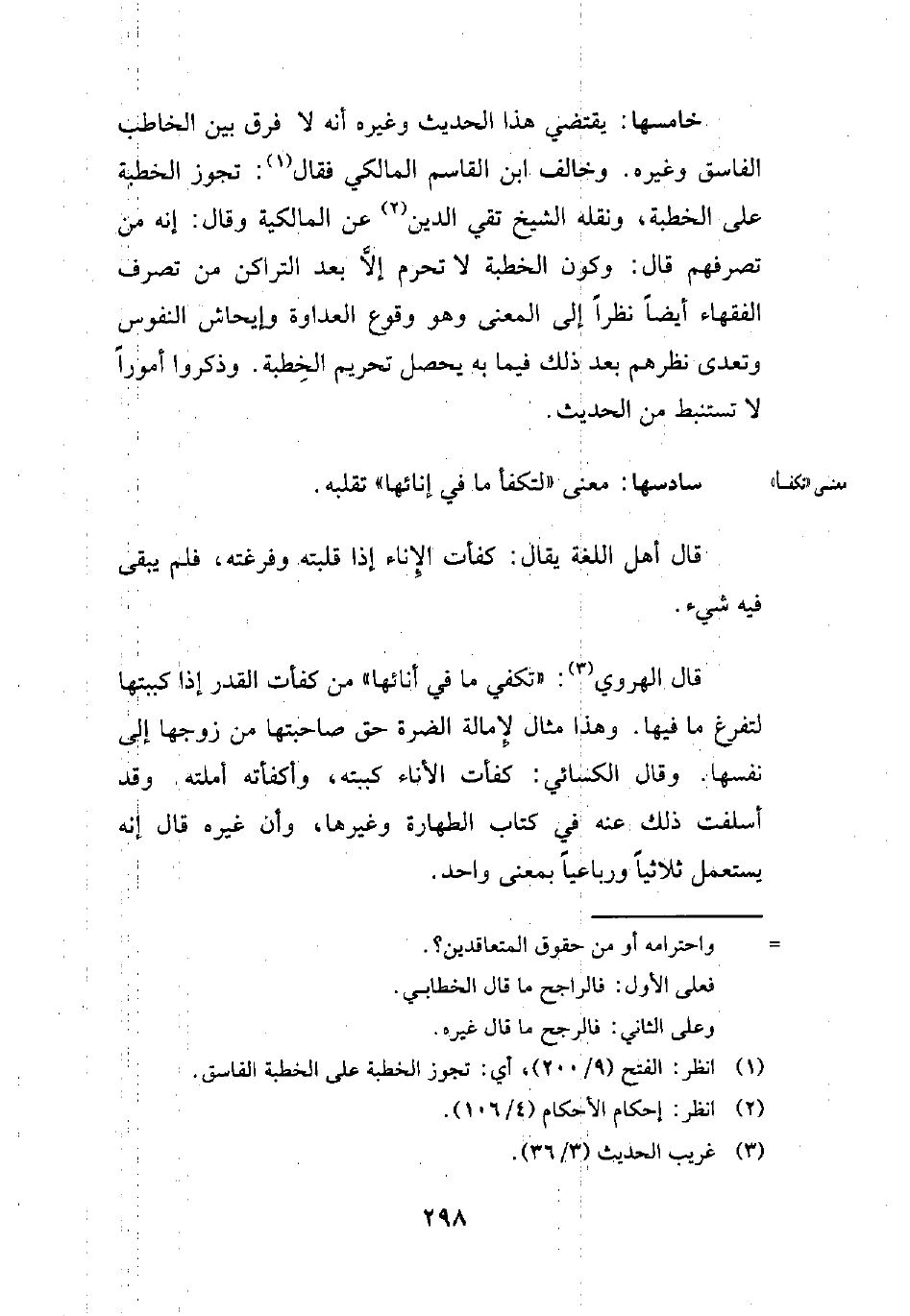 خامسها: يقتضي هذا الحديث وغيره أنه لا فرق بين الخاطب الفاسق وغيره. وخالف ابن القاسم المالكي فقال (¬1): تجوز الخطبة على الخطبة، ونقله الشيخ تقي الدين (¬2) عن المالكية وقال: إنه من تصرفهم قال: وكون الخطبة لا تحرم إلاَّ بعد التراكن من تصرف الفقهاء أيضاً نظراً إلى المعنى وهو وقوع العداوة وإيحاش النفوس وتعدى نظرهم بعد ذلك فيما به يحصل تحريم الخِطبة. وذكروا أموراً لا تستنبط من الحديث.