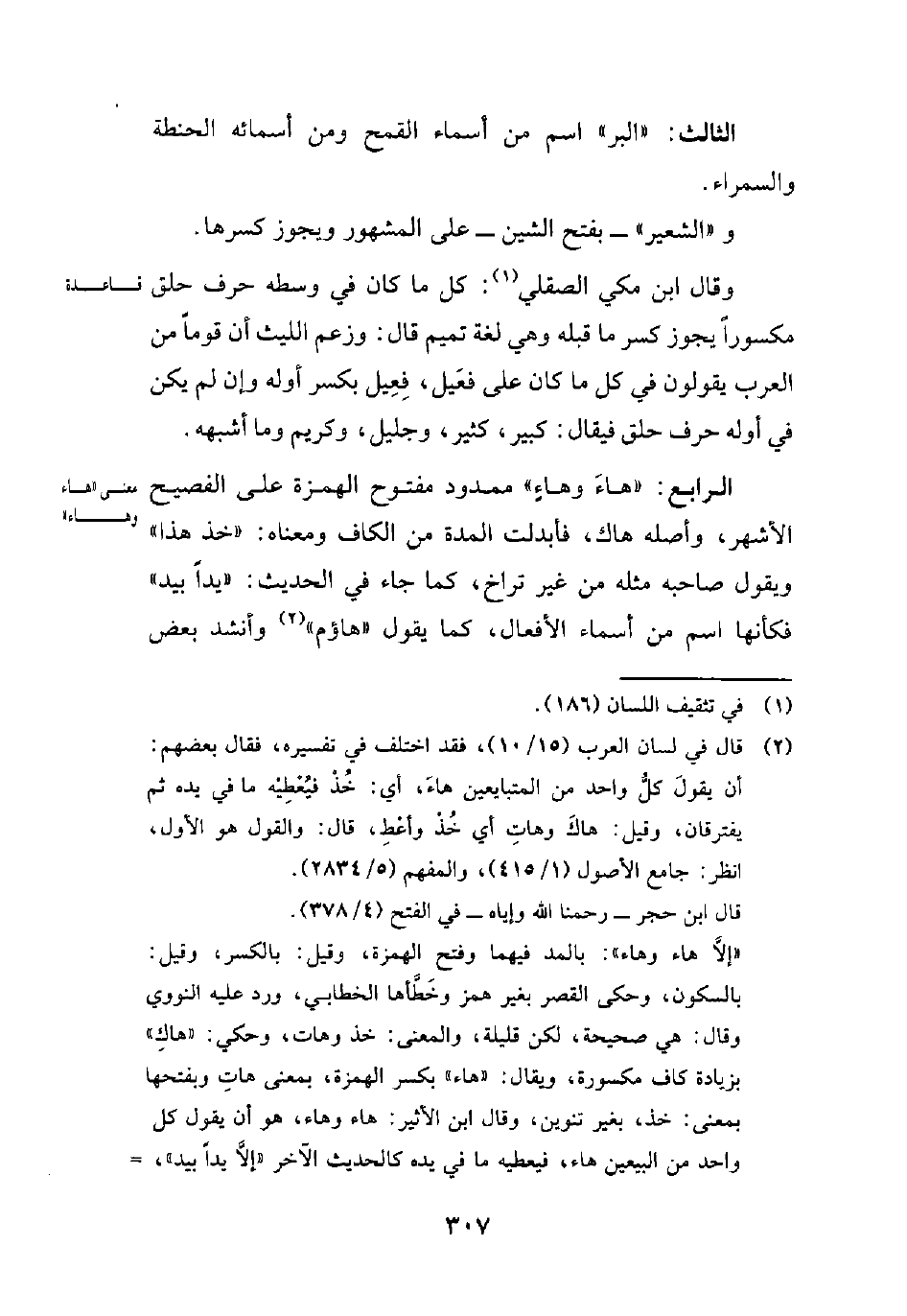 الرابع: "هاءَ وهاءٍ" ممدود مفتوح الهمزة على الفصيح الأشهر، وأصله هاك، فأبدلت المدة من الكاف ومعناه: "خذ هذا" ويقول صاحبه مثله عن غير تراخ، كما جاء في الحديث: "يداً بيد" فكأنها اسم من أسماء الأفعال، كما يقول "هاؤم" (¬2) وأنشد بعض