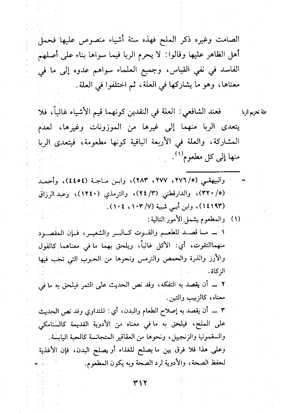 الصامت وغيرهـ ذكر الملح فهذه ستة أشياء منصوص عليها فحمل أهل الظاهر عليها وقالوا: لا يحرم الربا فيما سواها بناء على أصلهم الفاسد في نفي القياس، وجميع العلماء سواهم عدوه إلى ما في معناها، وهو ما يشاركها في العلة، ثم اختلفوا في العلة.