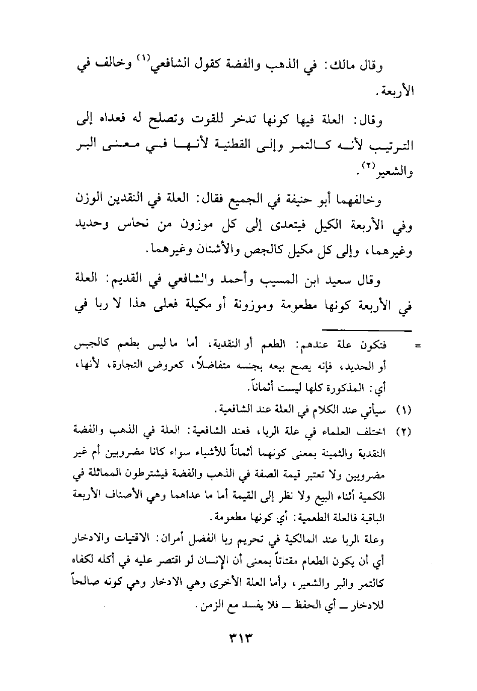 (¬2) اختلف العلماء في علة الربا، فعند الشافعية: العلة في الذهب والفضة النقدية والثمينة بمعنى كونهما أثماناً للأشياء سواء كانا مضروبين أم غير مضروبين ولا تعتبر قيمة الصفة في الذهب والفضة فيشترطون المماثلة في الكمية أثناء البيع ولا نظر إلى القمة أما ما عداهما وهي الأصناف الأربعة الباقية فالعلة الطعمية: أي كونها مطعومة.