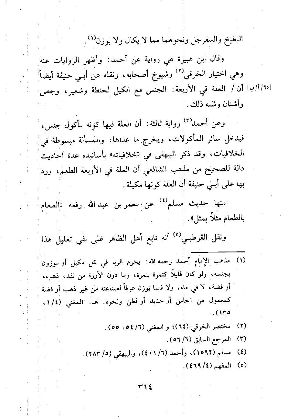 (¬1) مذهب الإِمام أحمد -رحمه الله-: يحرم الربا في كل مكيل أو موزون بجنسه، ولو كان قليلاً كتمرة بتمرة، وما دون الأرزة من نقد، ذهب، أو فضة، لا في ماء، ولا فيما يوزن عرفاً لصناعته من غير ذهب أو فضة كمعمول من نحاس أو حديد أو قطن ونحوه. اهـ. المغني (4/ 1، 135).