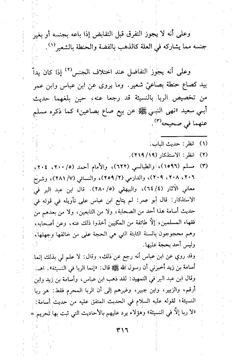 (¬3) مسلم (1596)، والطيالسي (622)، والإِمام أحمد (5/ 200، 204، 206، 208، 209)، والدارمي (2/ 259) , والنسائي (7/ 281)، وشرح معاني الآثار (4/ 64)، والبيهقي (5/ 280). قال ابن عبد البر في الاستذكار: قال أبو عمر: لم يتابع ابن عباس على تأويله في قوله في حديث أسامة هذا أحد من الصحابة، ولا من التابعين، ولا من بعدهم من فقهاء المسلمين، إلاَّ طائفة من المكيين أخذوا ذلك عنه، وعن أصحابه، وهم محجوجون بالسنة الثابنة التي هي الحجة على من خالفها وجهلها، وليس أحد بحجة عليها.