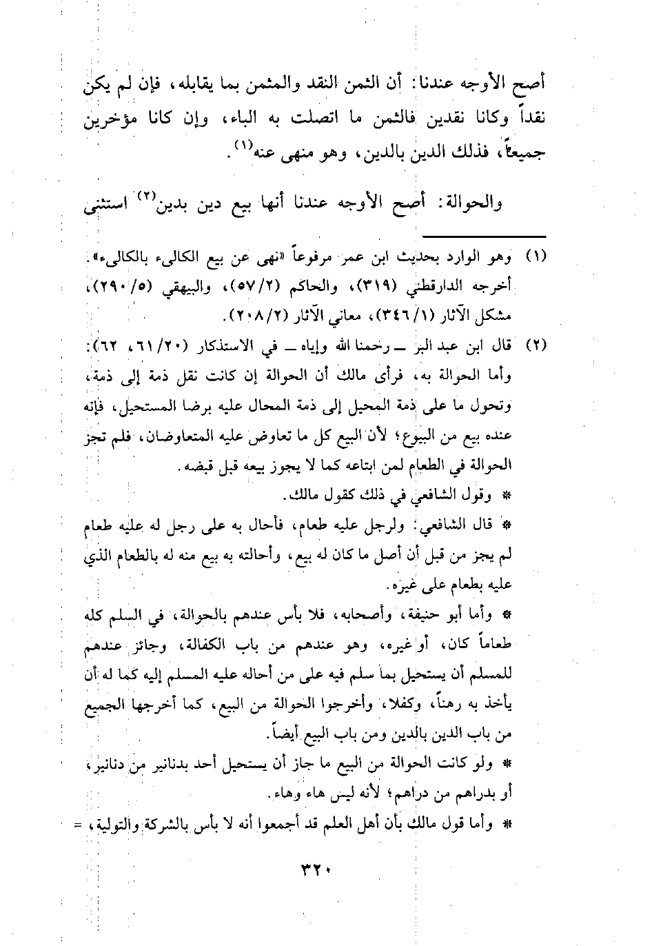 (¬2) قال ابن عبد البر -رحمنا الله وإياه- في الاستذكار (20/ 61، 62): وأما الحوالة به، فرأى مالك أن الحوالة إن كانت نقل ذمة إلى ذمة، وتحول ما على ذمة المحيل إلى ذمة المحال عليه برضا المستحيل، فإنه عنده بيع من البيوع؛ لأن البيع كل ما تعاوض عليه المتعاوضان، فلم تجز الحوالة في الطعام لمن ابتاعه كما لا يجوز بيعه قبل قبضه.