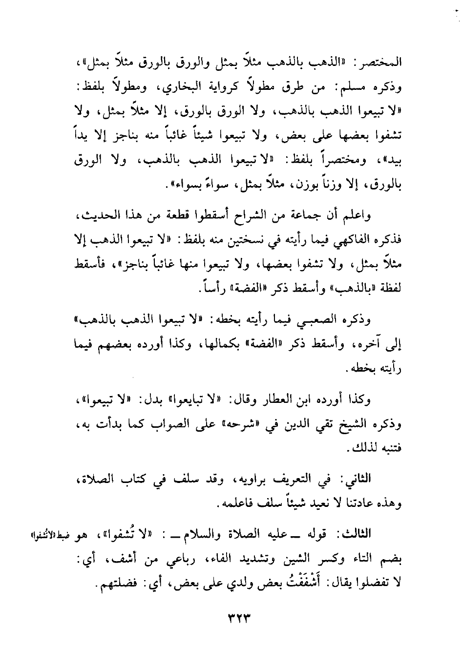 وذكره الصعبي فيما رأيته بخطه: "لا تبيعوا الذهب بالذهب" إلى آخره، وأسقط ذكر "الفضة" بكمالها، وكذا أورده بعضهم فيما رأيته بخطه.
