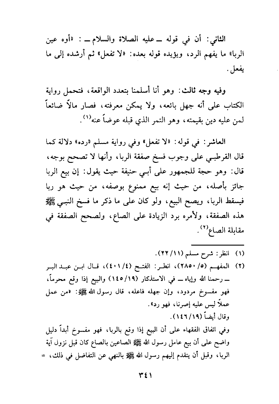 العاشر: في قوله: "لا تفعل" وفي رواية مسلم "رده" دلالة كما قال القرطبي على وجوب فسخ صفقة الربا، وأنها لا تصحح بوجه، قال: وهو حجة للجمهور على أبي حنيفة حيث يقول: إن بيع الربا جائز بأصله، من حيث إنه بيع ممنوع بوصفه، من حيث هو ربا فيسقط الربا، ويصح البيع، ولو كان على ما ذكر ما فسخ النبي - صلى الله عليه وسلم - هذه الصفقة، ولأمره برد الزيادة على الصاع، ولصحح الصفقة في مقابلة الصاع (¬2).