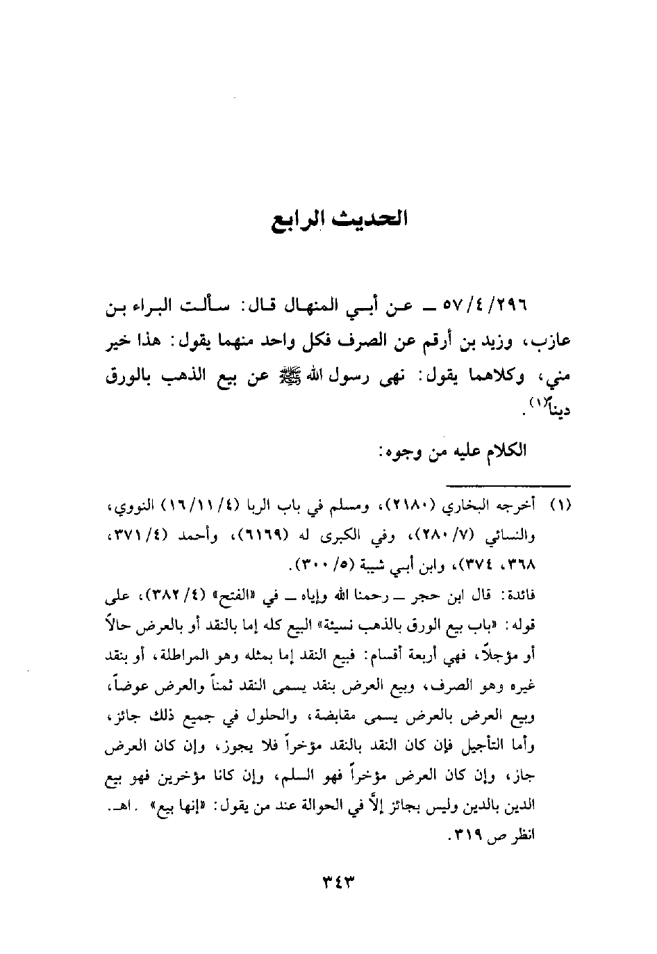 296/ 4/ 57 - عن أبي المنهال قال: سألت البراء بن عازب، وزيد بن أرقم عن الصرف فكل واحد منهما يقول: هذا خير مني, وكلاهما يقول: نهى رسول الله - صلى الله عليه وسلم - عن بيع الذهب بالورق ديناً (¬1).