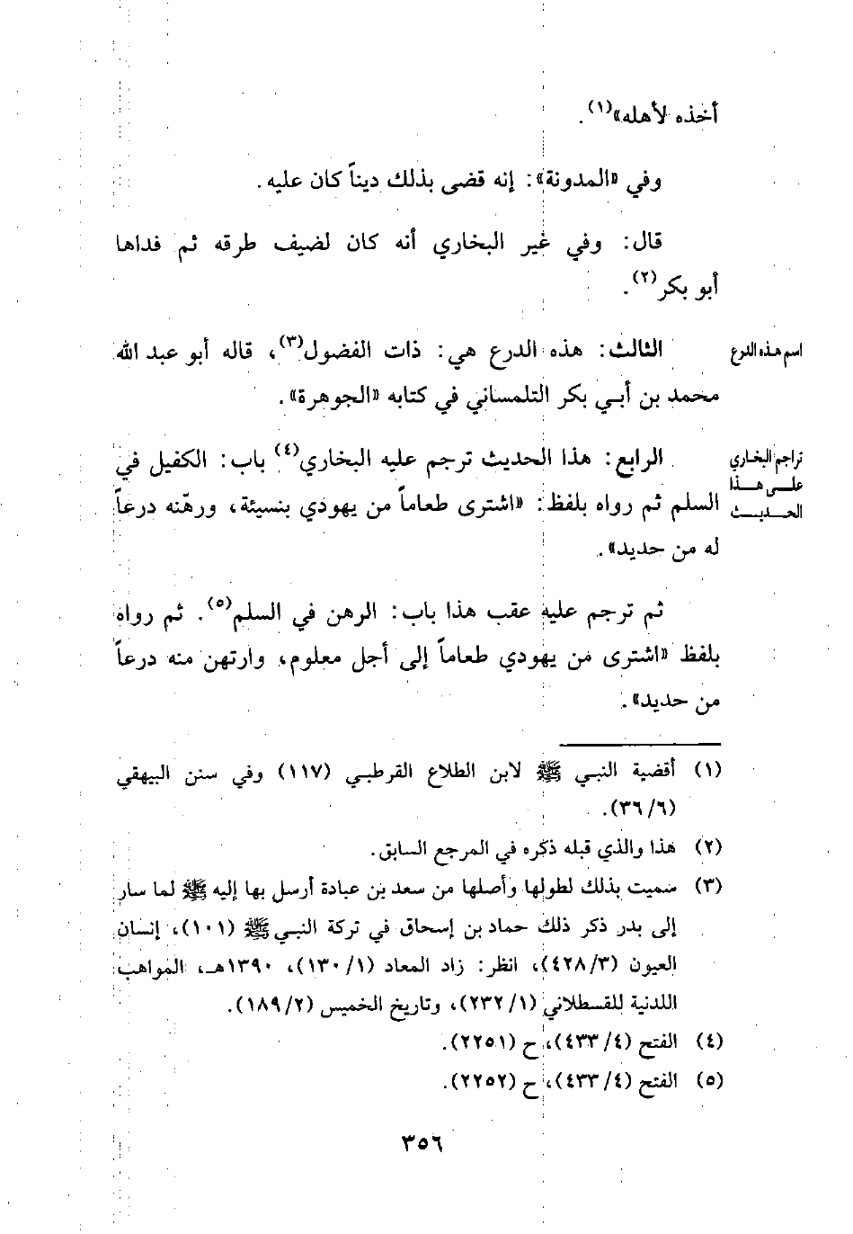 الرابع: هذا الحديث ترجم عليه البخاري (¬4) باب: الكفيل في السلم ثم رواه بلفظ: "اشترى طعاماً من يهودي بنسيئة، ورهّنه درعاً له من حديد".