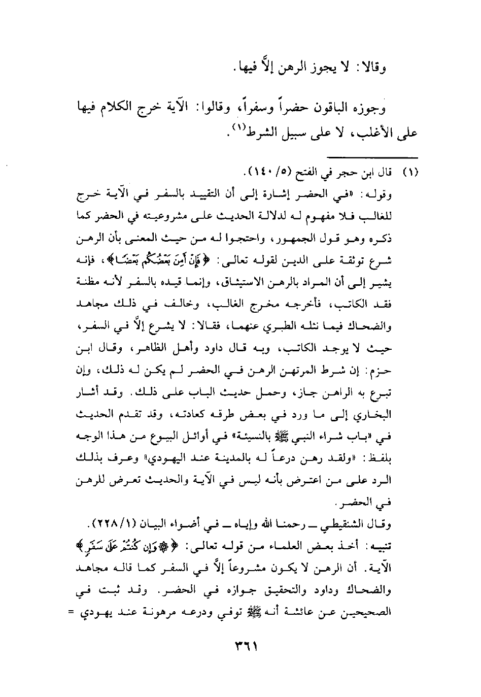 تنبيه: أخذ بعض العلماء من قوله تعالى: {وَإِنْ كُنْتُمْ عَلَى سَفَرٍ} الآية. أن الرهن لا يكون مشروعاً إلاَّ في السفر كما قاله مجاهد والضحاك وداود والتحقيق جوازه في الحضر. وقد ثبت في الصحيحين عن عائشة أنه - صلى الله عليه وسلم - توفي ودرعه مرهونة عند يهودي =