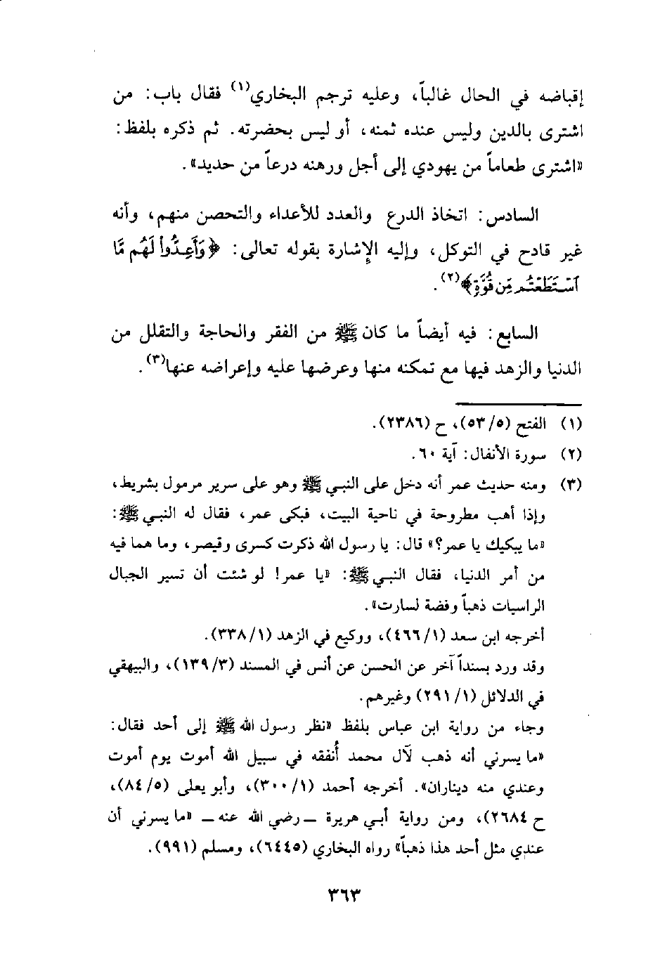 السادس: اتخاذ الدرع والعدد للأعداء والتحصن منهم، وأنه غير قادح في التوكل، وإليه الإِشارة بقوله تعالى: {وَأَعِدُّوا لَهُمْ مَا اسْتَطَعْتُمْ مِنْ قُوَّةٍ} (¬2).