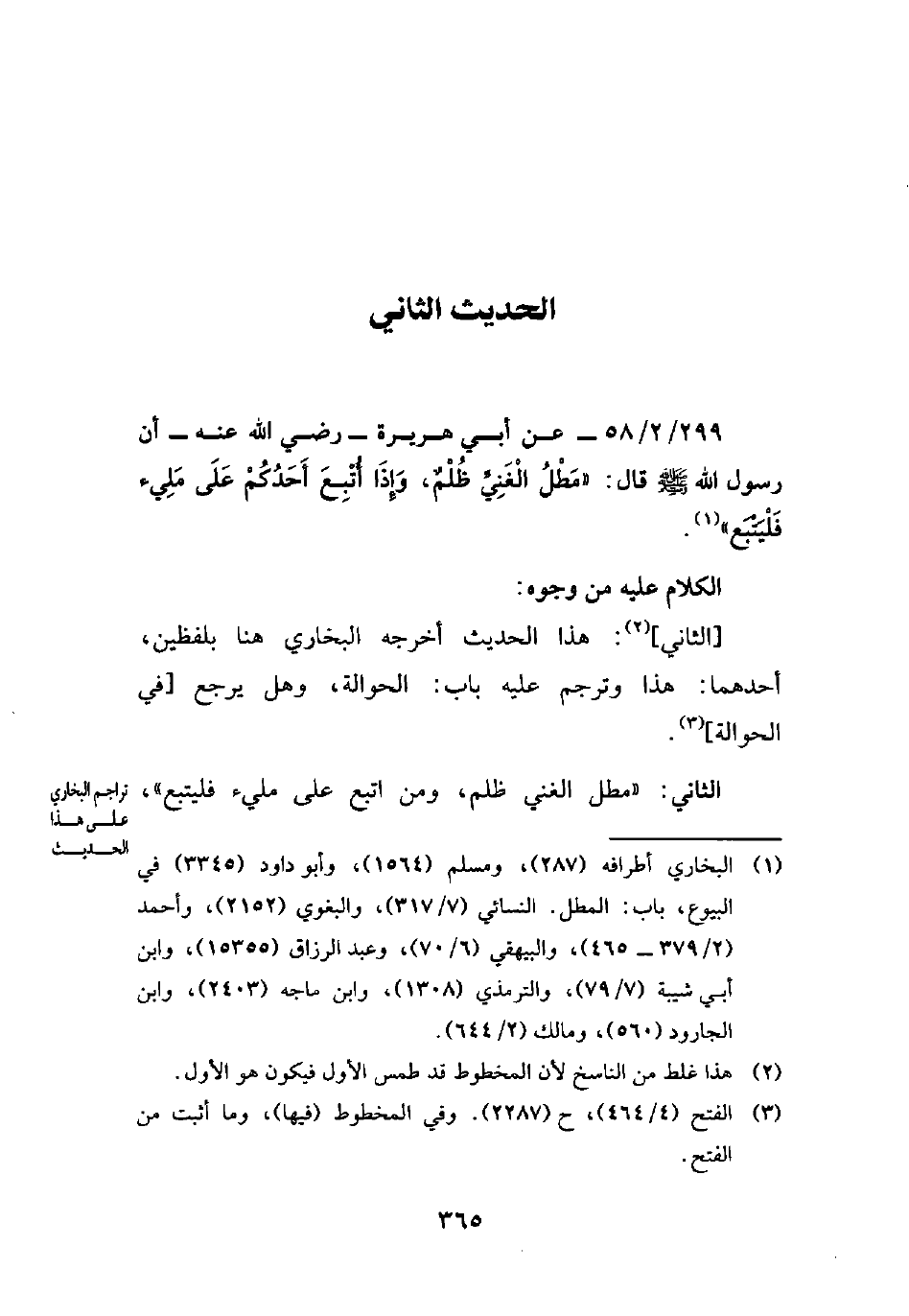 299/ 2/ 58 - عن أبي هريرة -رضي الله عنه- أن رسول الله - صلى الله عليه وسلم - قال: "مَطْلُ الْغَنِيِّ ظُلْمٌ، وَإِذَا أُتْبِعَ أَحَدُكُمْ عَلَى مَلِيء فَلْيَتْبَع" (¬1).