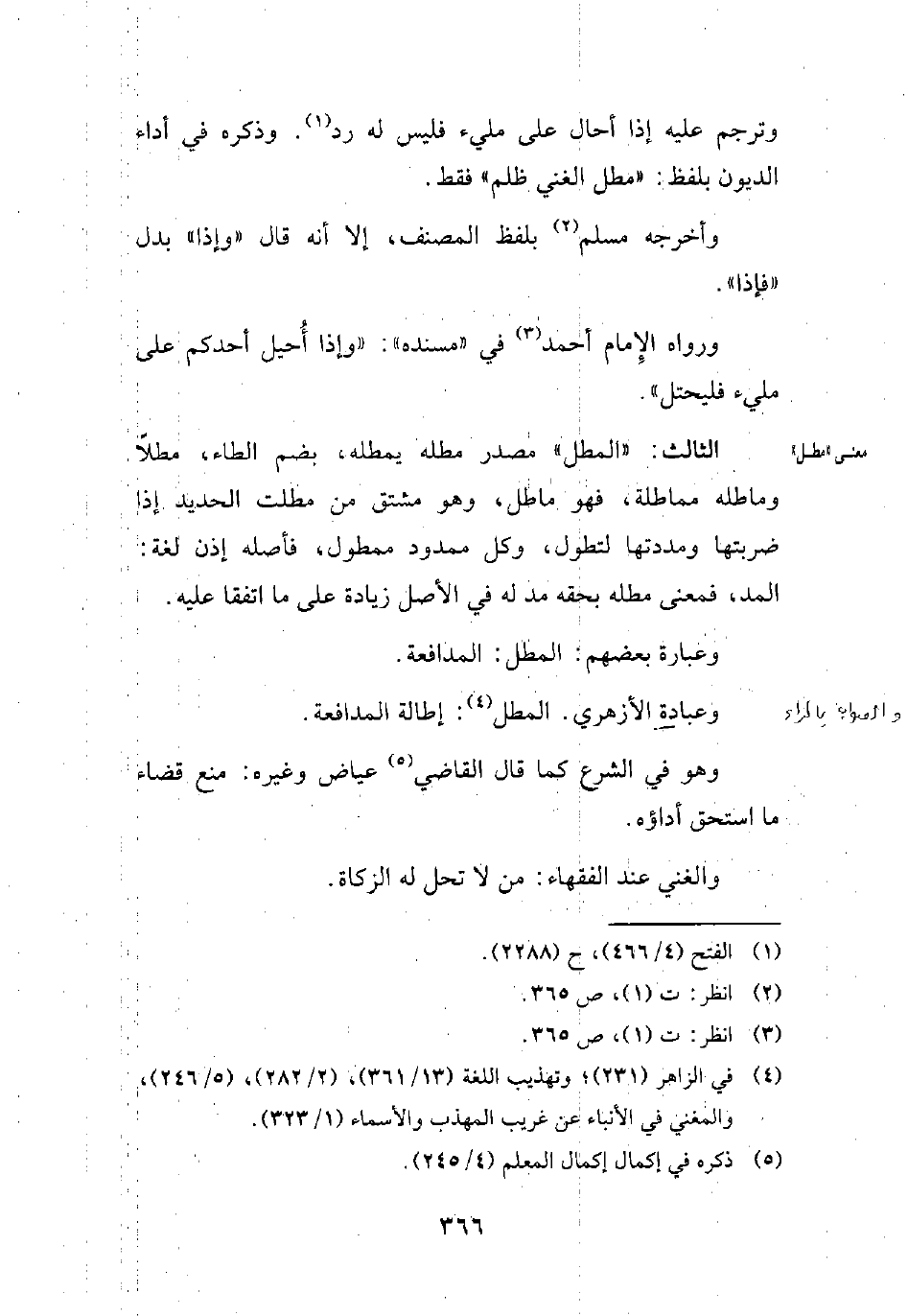 الثالث: "المطل" مصدر مطله يمطله، بضم الطاء، مطلاً وماطله مماطلة، فهو ماطل، وهو مشتق من مطلت الحديد إذا ضربتها ومددتها لتطول، وكل ممدود ممطول، فأصله إذن لغة: المد، فمعنى مطله بحقه مد له في الأصل زيادة على ما اتفقا عليه.