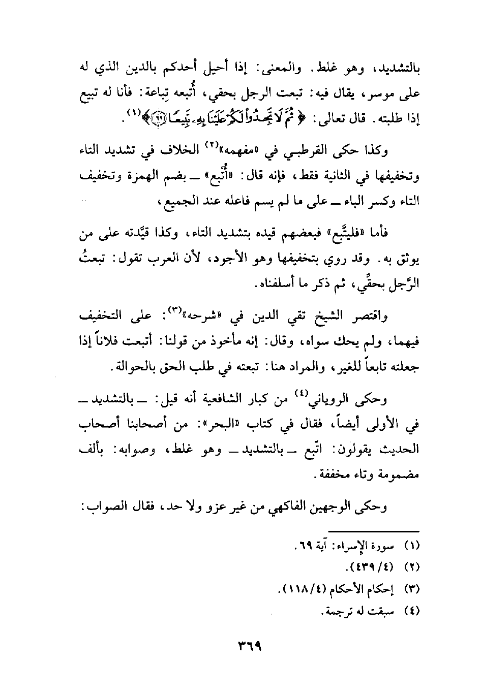وحكى الروياني (¬4) من كبار الشافعية أنه قيل: -بالتشديد- في الأولى أيضاً، فقال في كتاب "البحر": من أصحابنا أصحاب الحديث يقولون: اتّبع -بالتشديد- وهو غلط، وصوابه: بألف مضمومة وتاء مخففة.